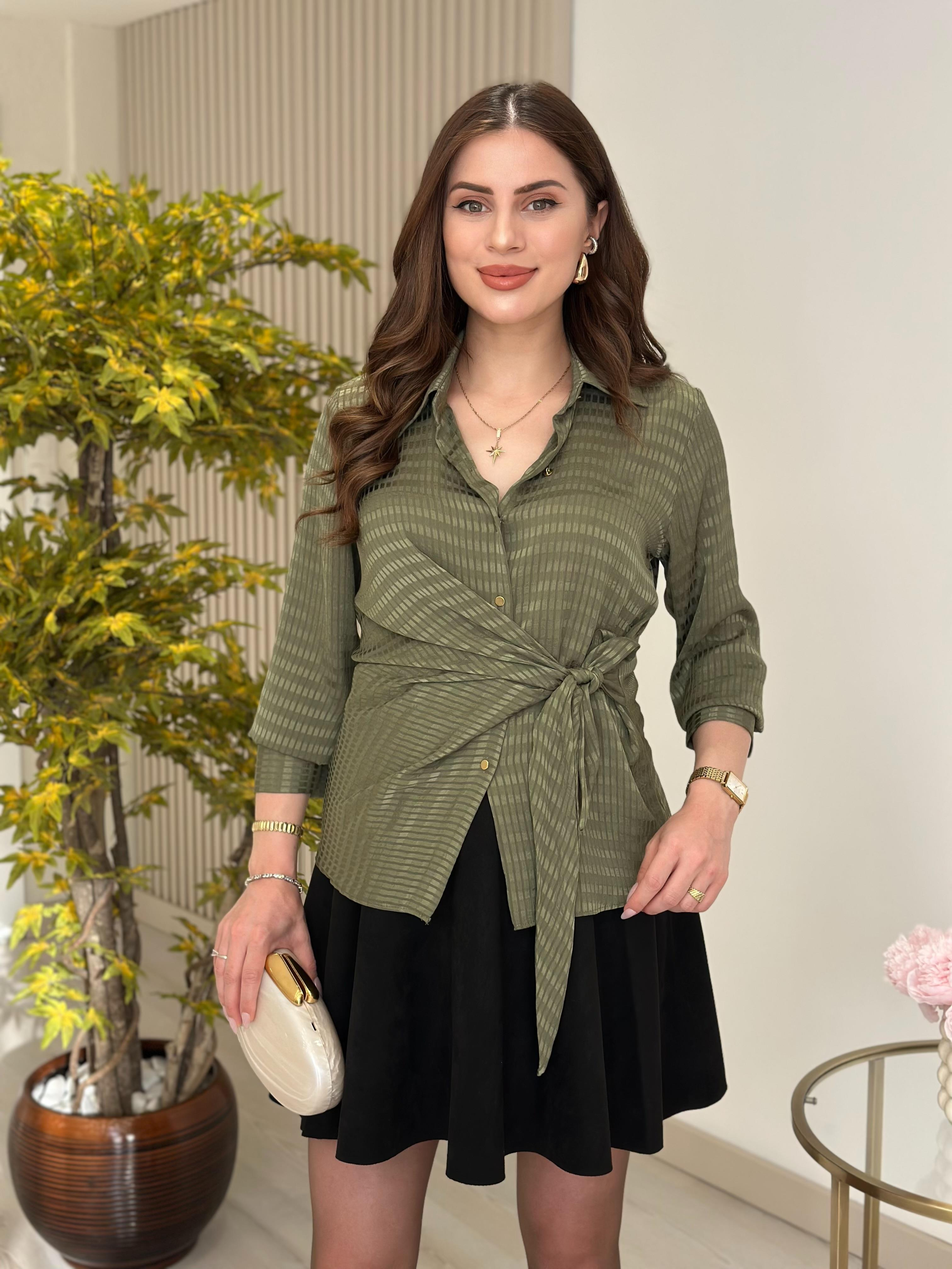 Beli Bağlama Detaylı Gold Düğmeli Gömlek Haki Yeşil