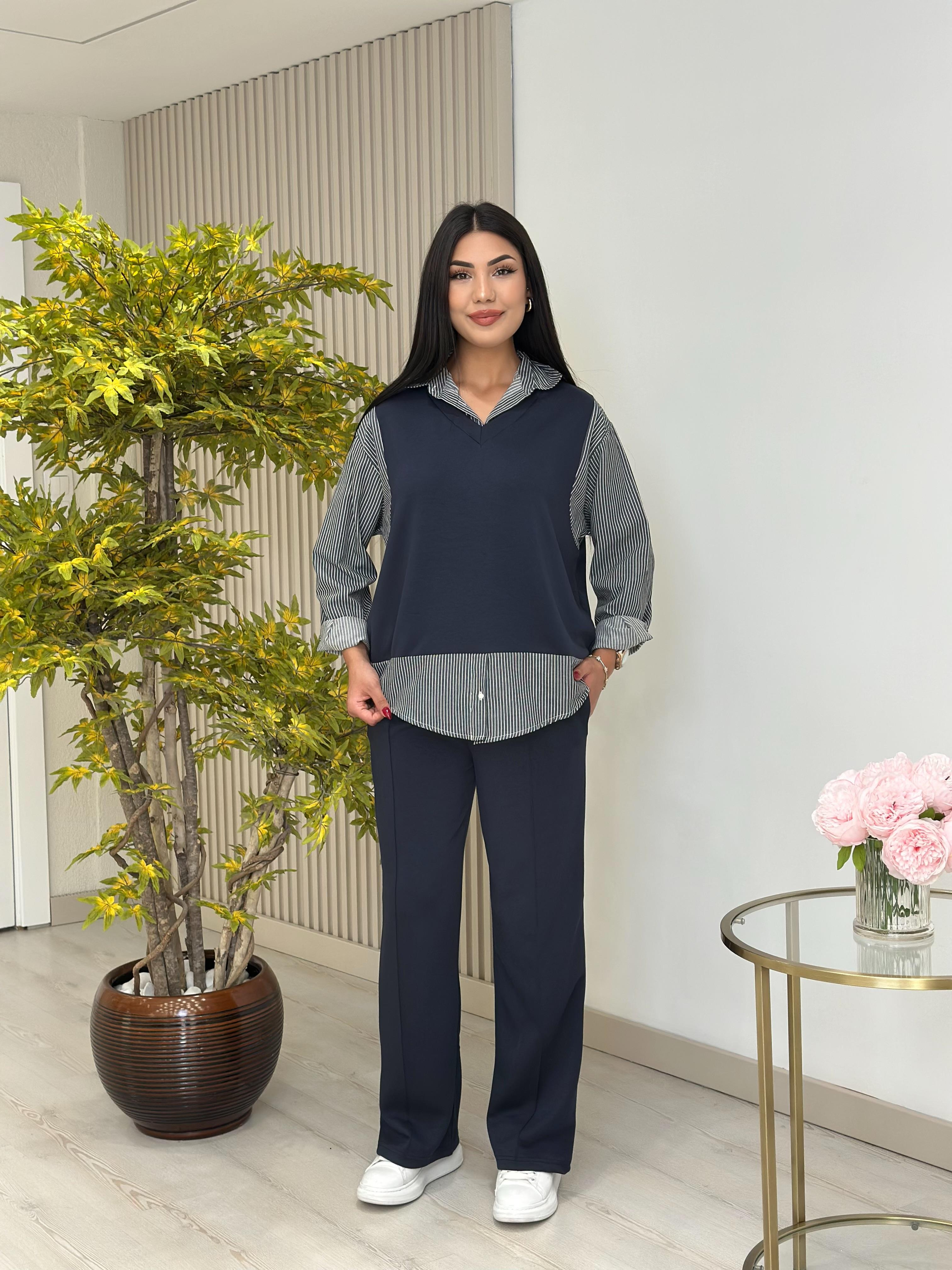Çizgili Gömlek Detaylı Modal Kumaş Takım Antrasit