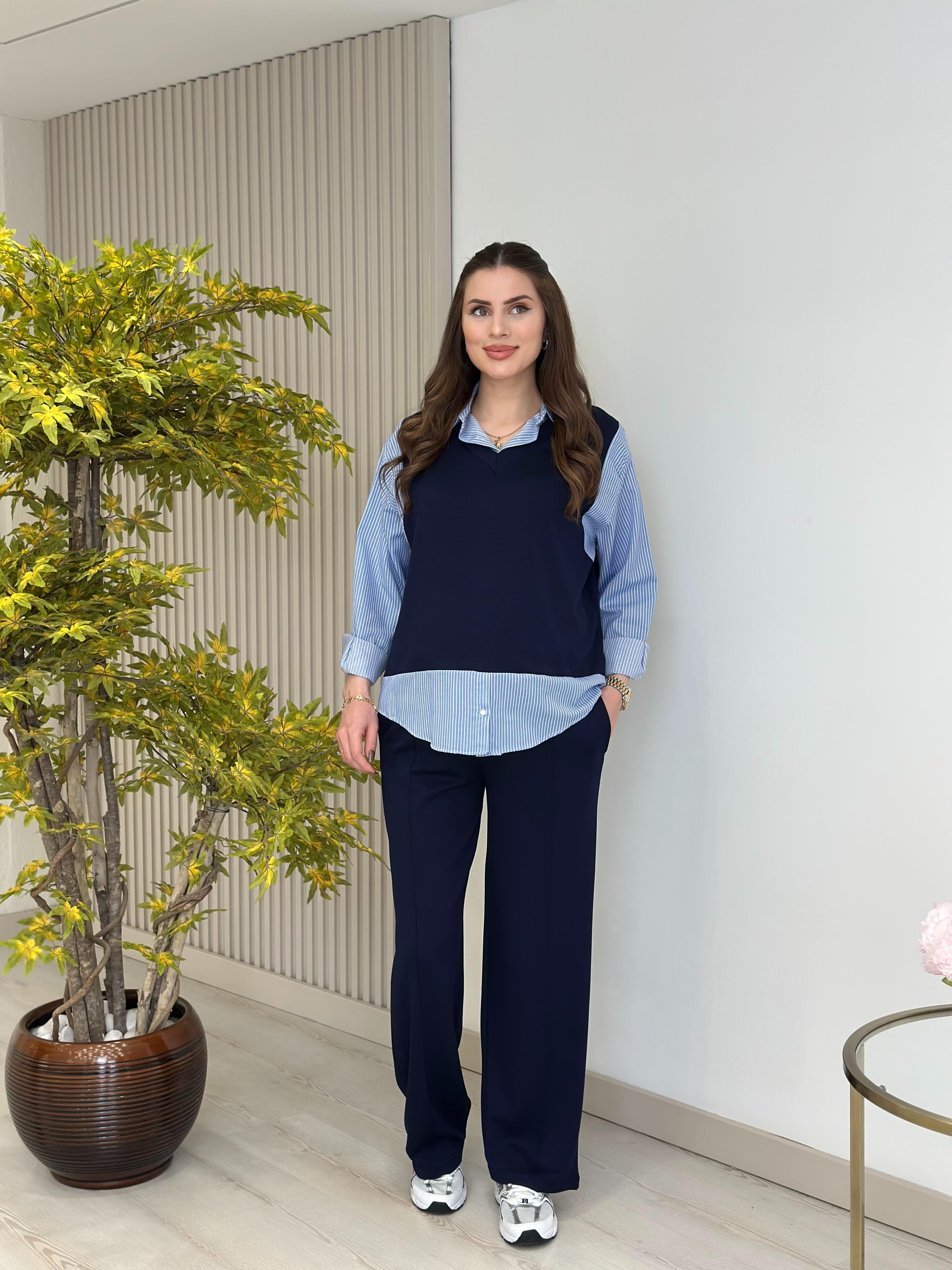 Çizgili Gömlek Detaylı Modal Kumaş Takım Lacivert