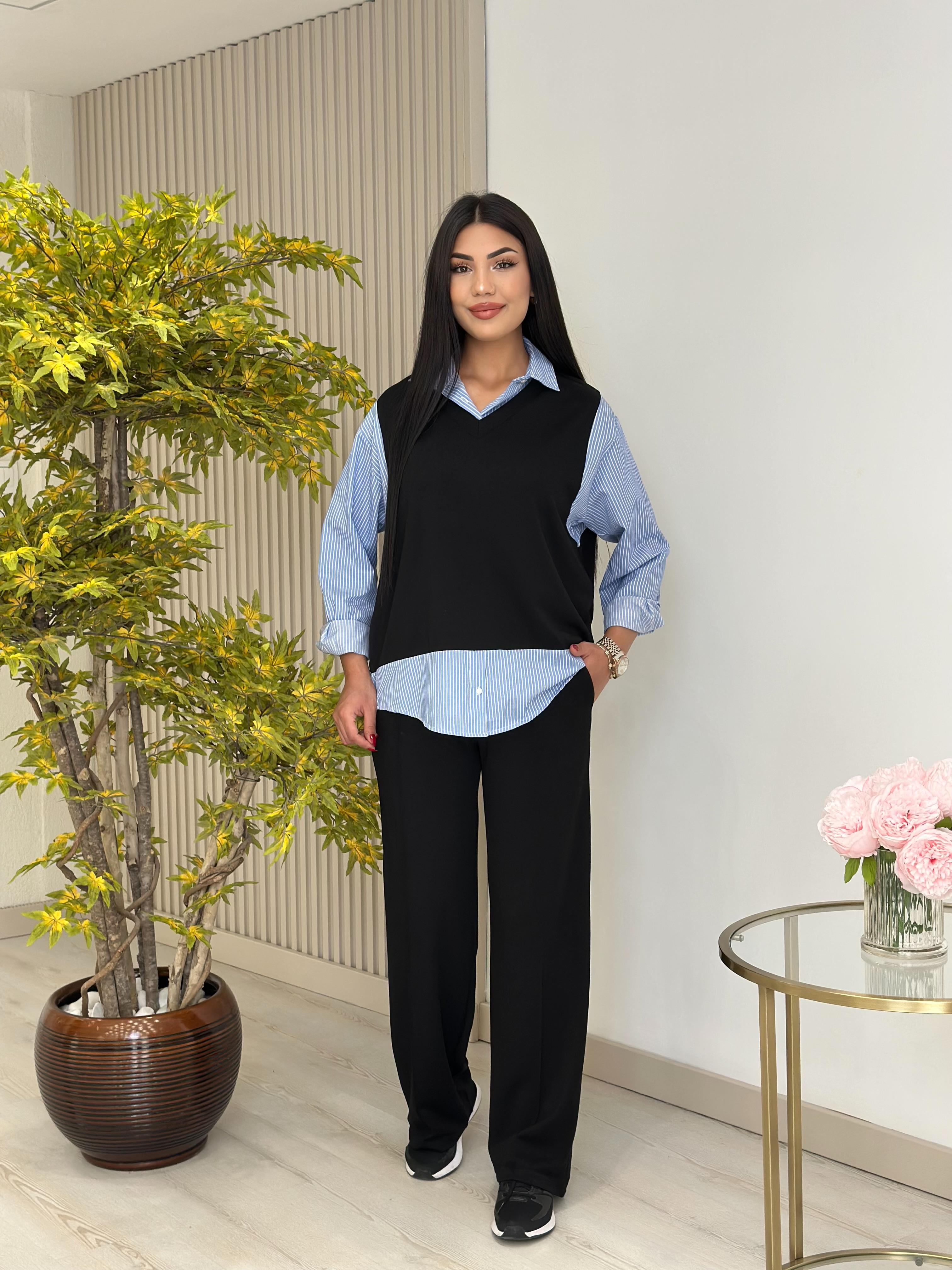 Çizgili Gömlek Detaylı Modal Kumaş Takım Siyah