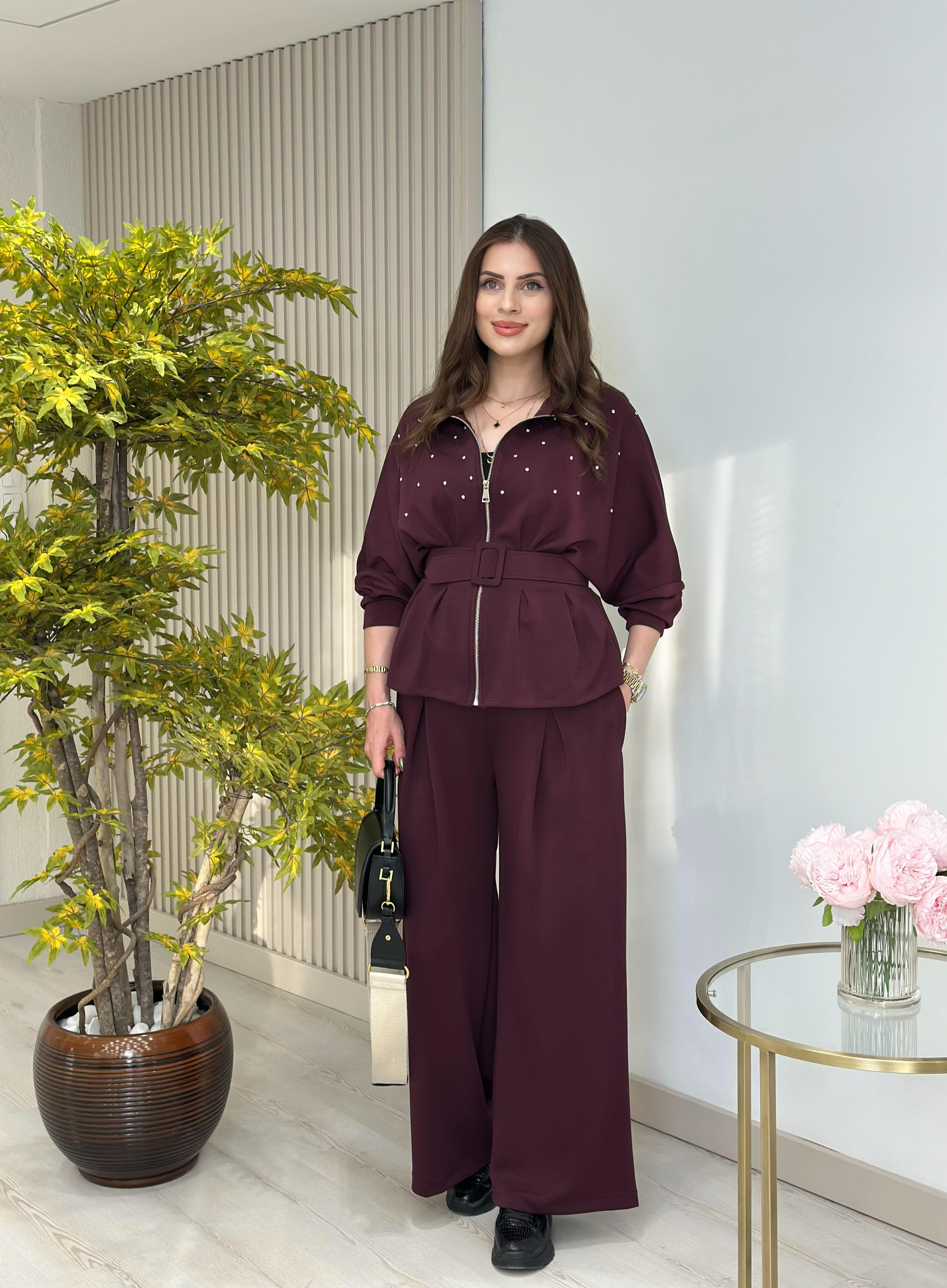 Dik Yaka Kemerli Taşlı Tok Dokulu Modal Kumaş Takım Mürdüm