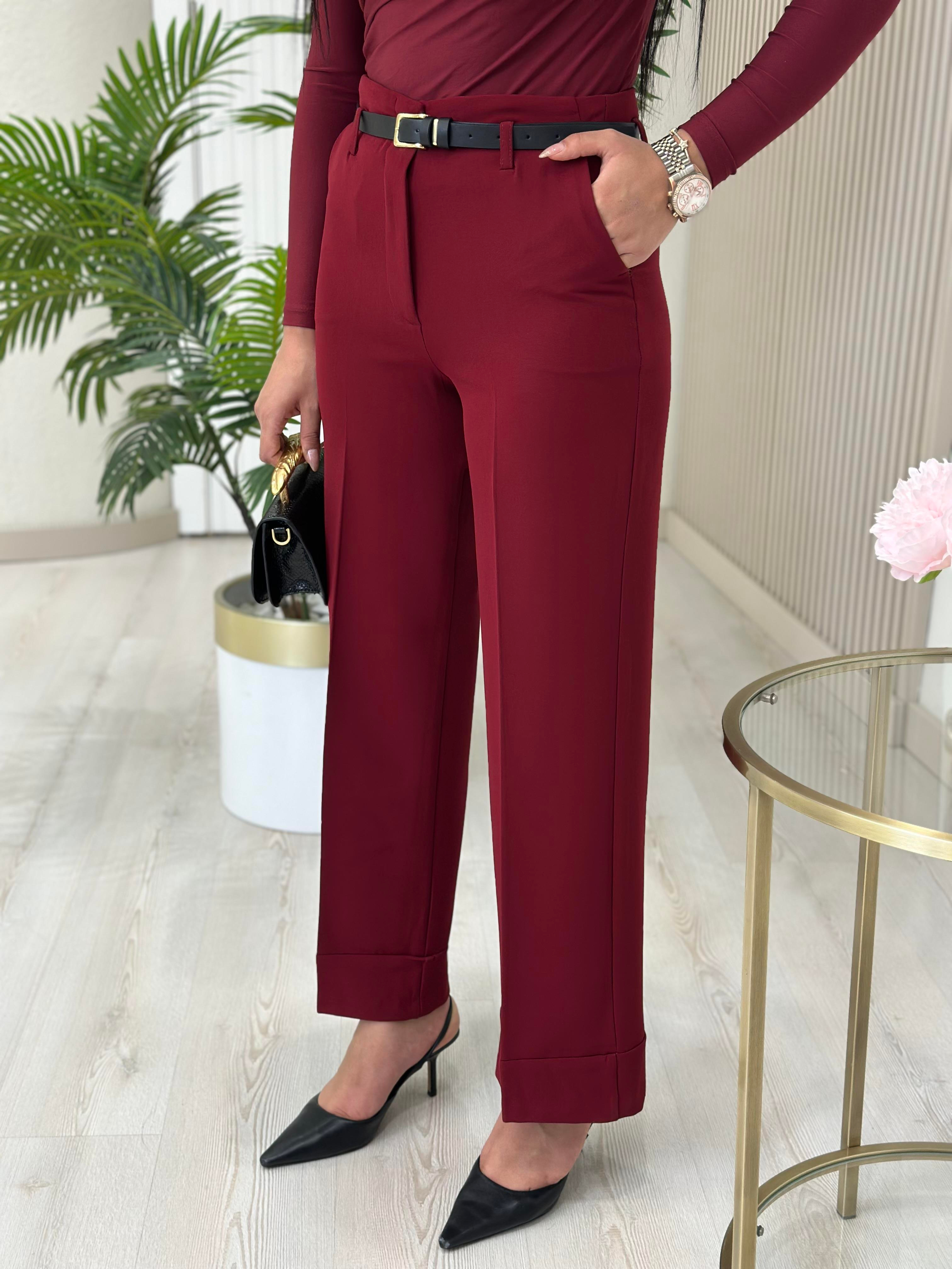 Double Paça Kemerli Kumaş Pantolon Bordo