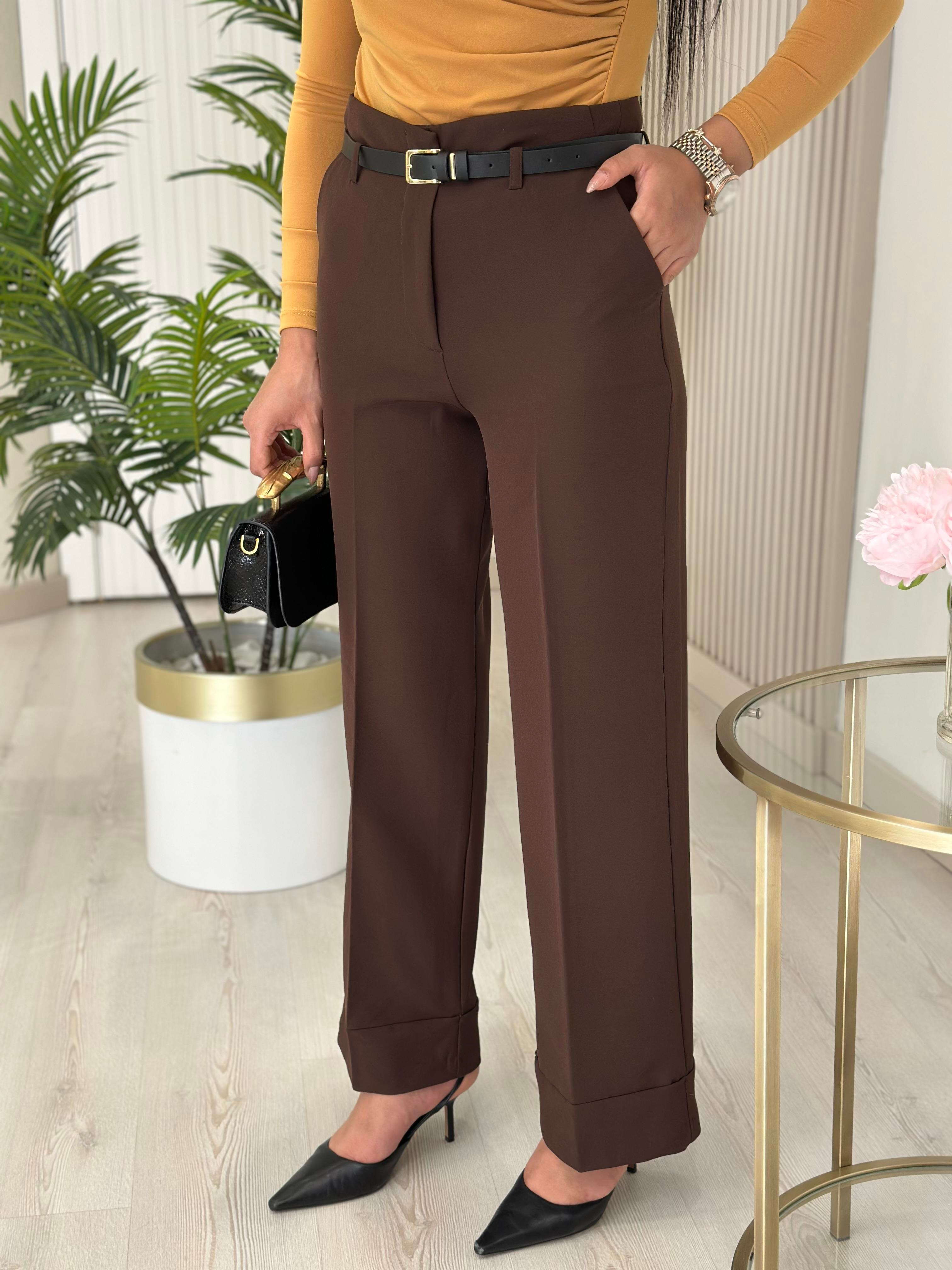 Double Paça Kemerli Kumaş Pantolon Kahve