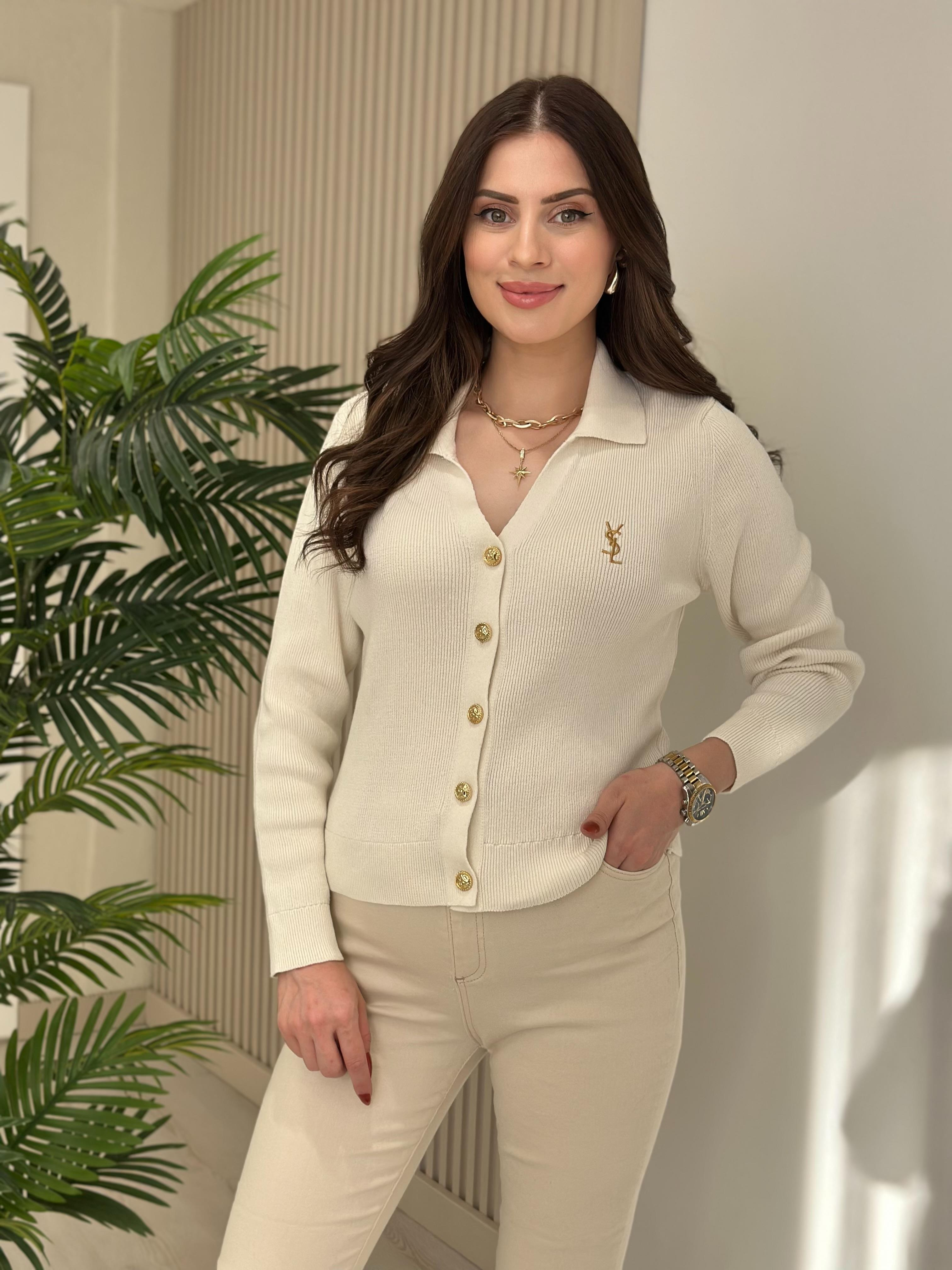 Gold Düğmeli Göğsü İşlemeli Hırka Bej