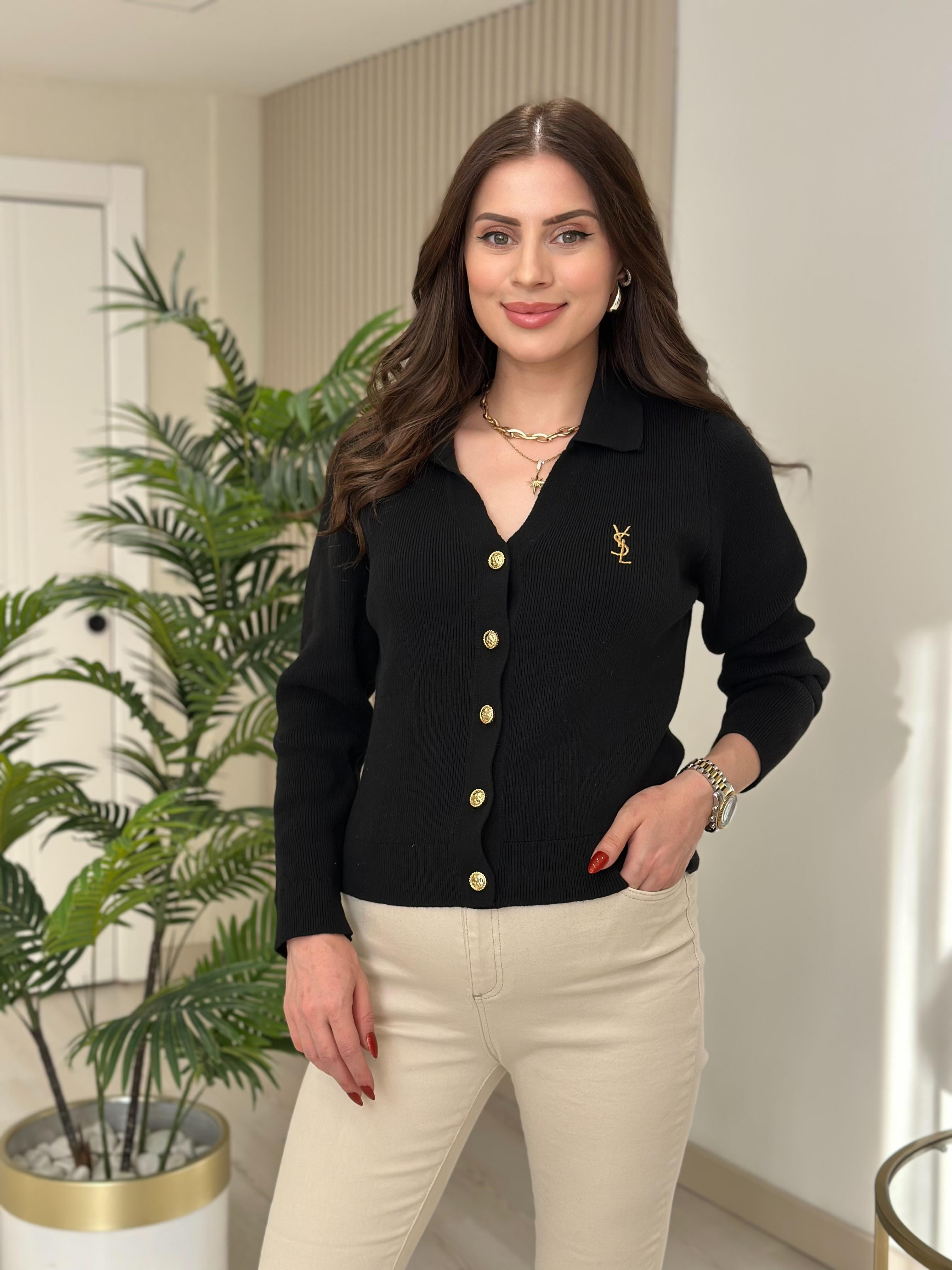 Gold Düğmeli Göğsü İşlemeli Hırka Siyah