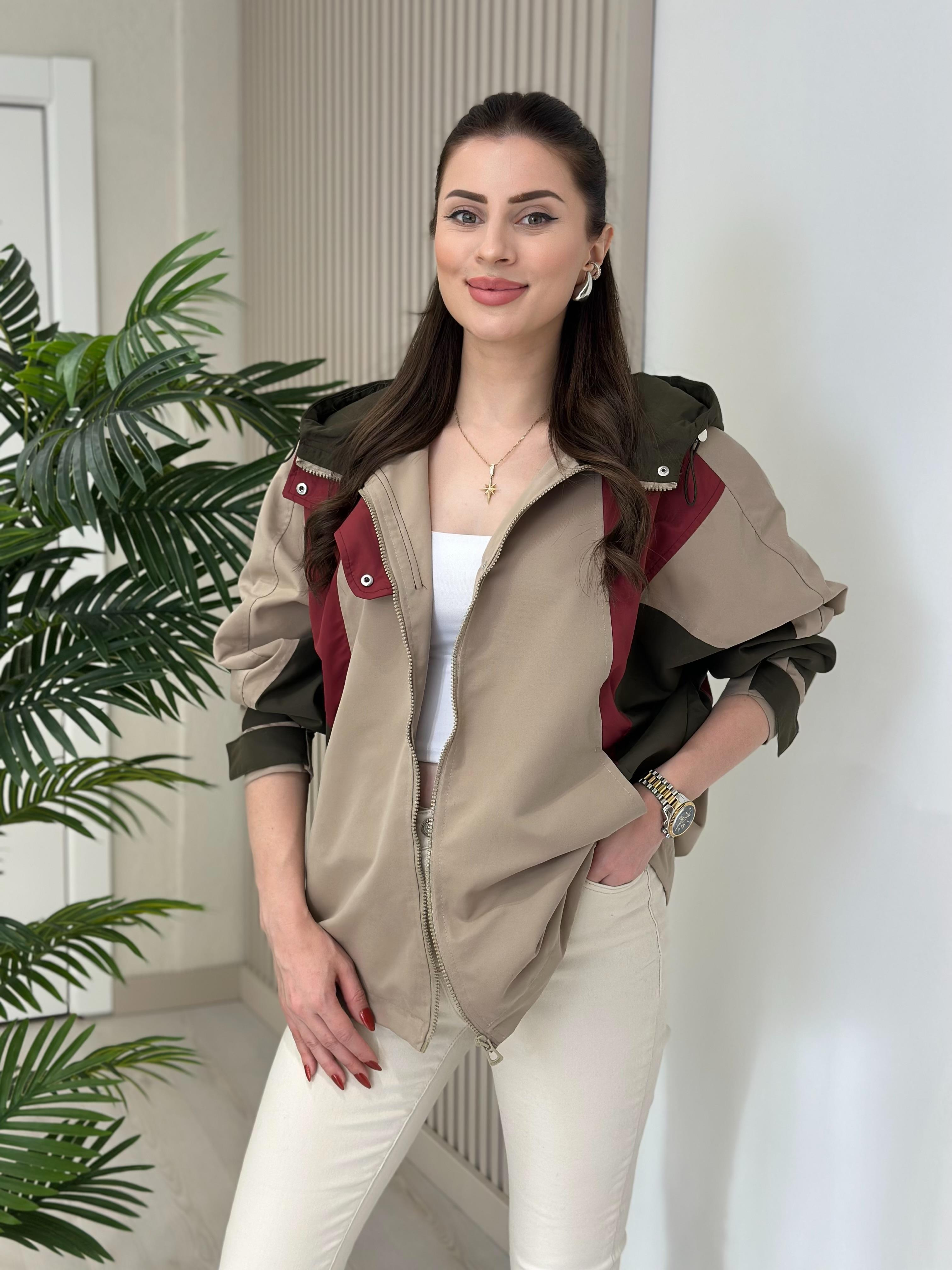 Kapşonlu Haki Bordo Geçişli Yağmurluk