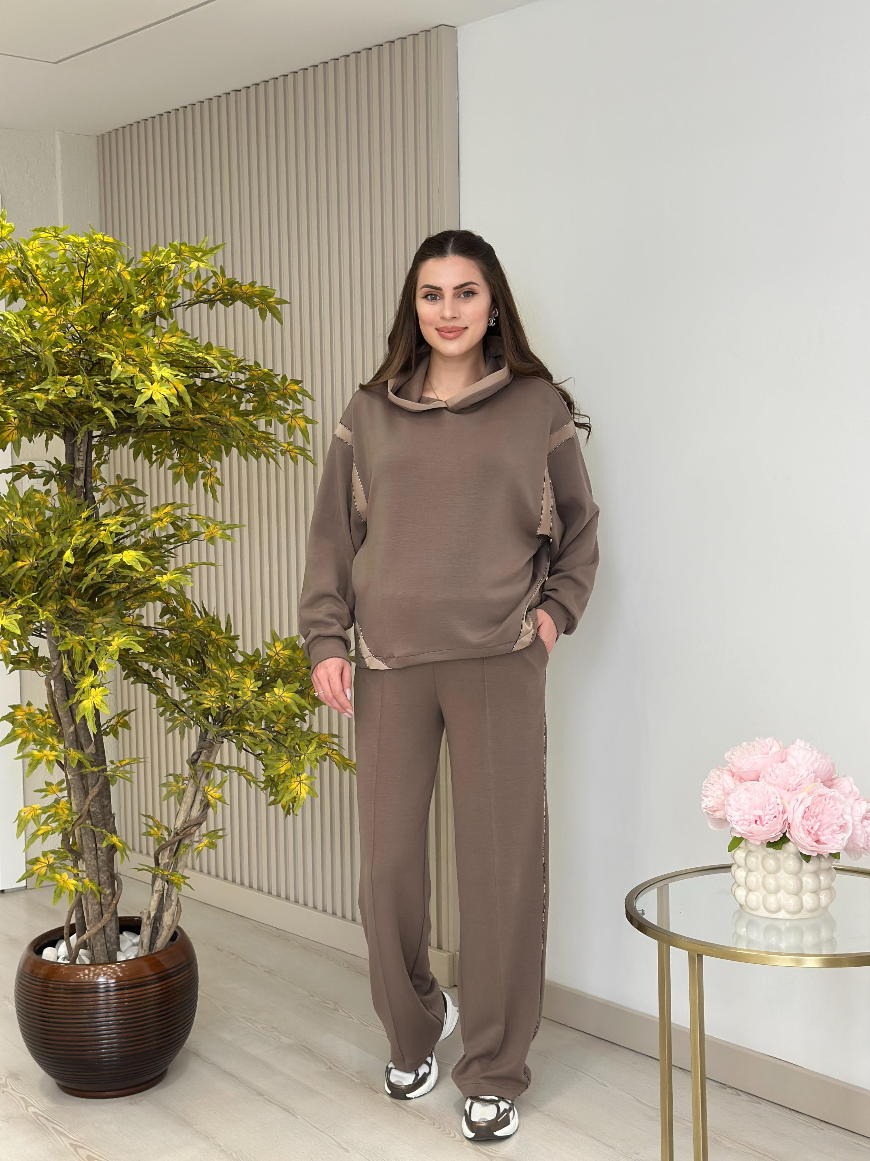 Kapşonlu Taş Detaylı Saten Biyeli Premium Modal Takım Vizon