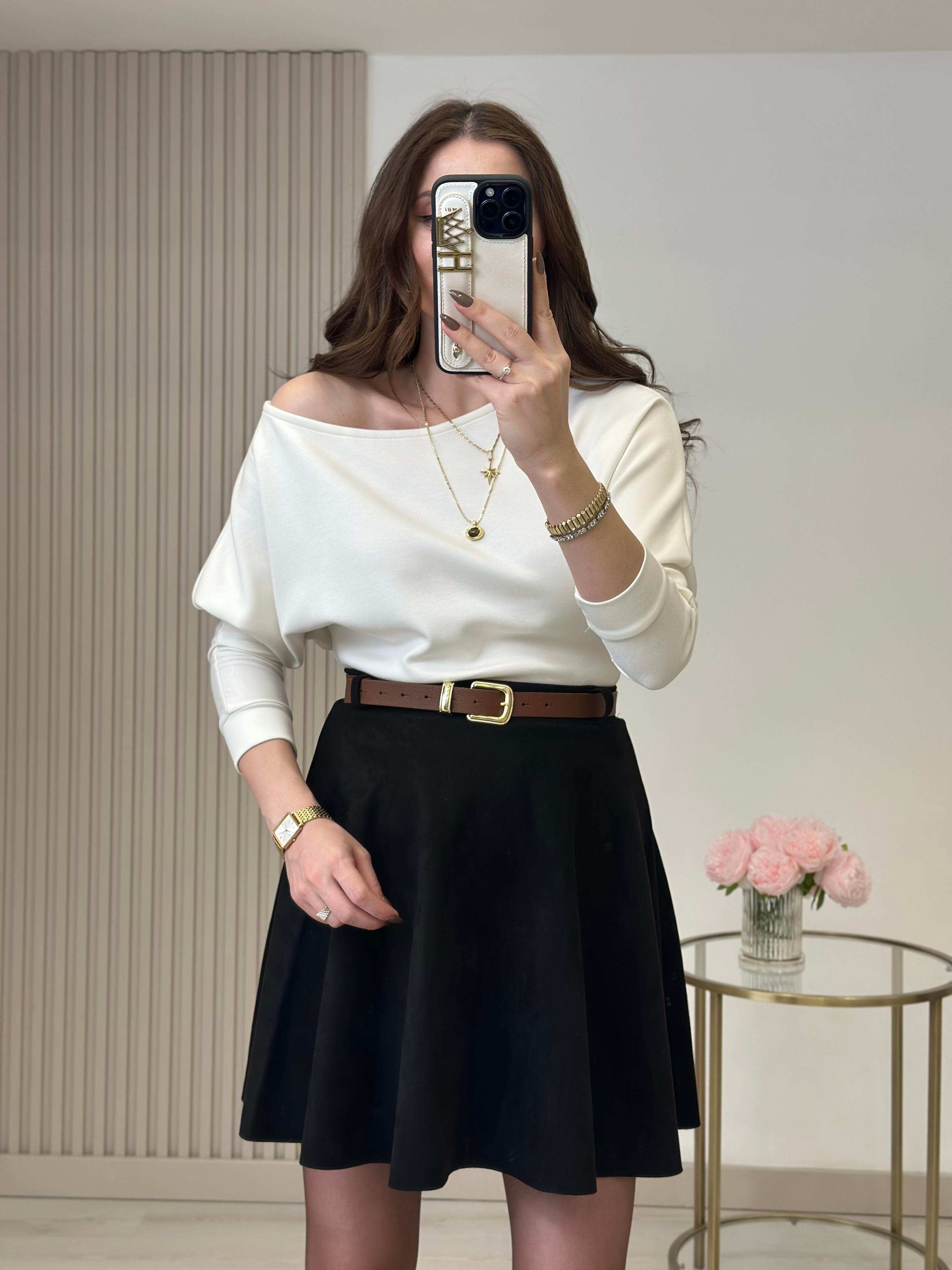Kayık Yaka Yarasa Kol Omuz Dekolteli Modal Kumaş Bluz Beyaz