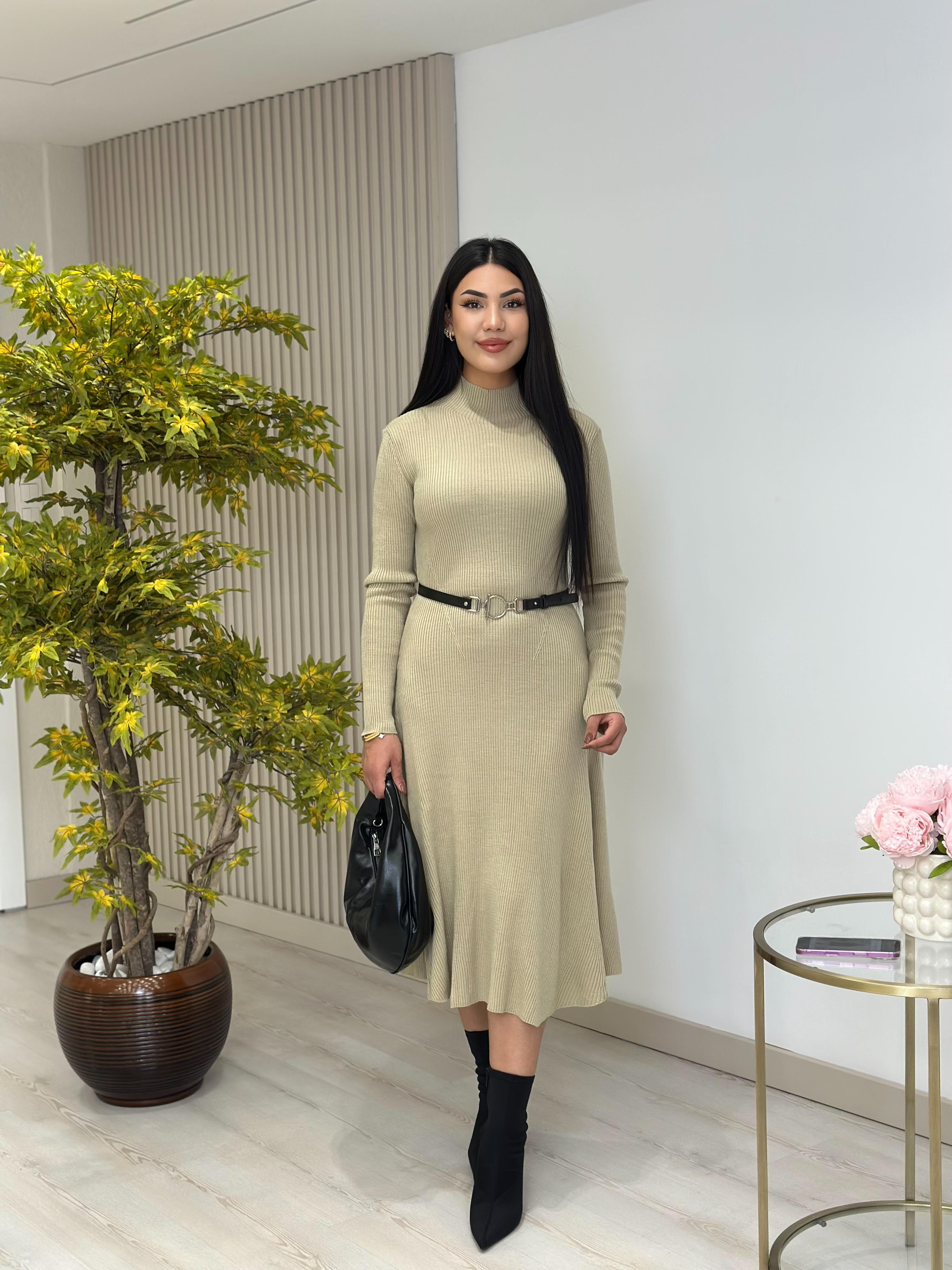 Kemerli Kloş Dik Yaka Triko Elbise Su Yeşili