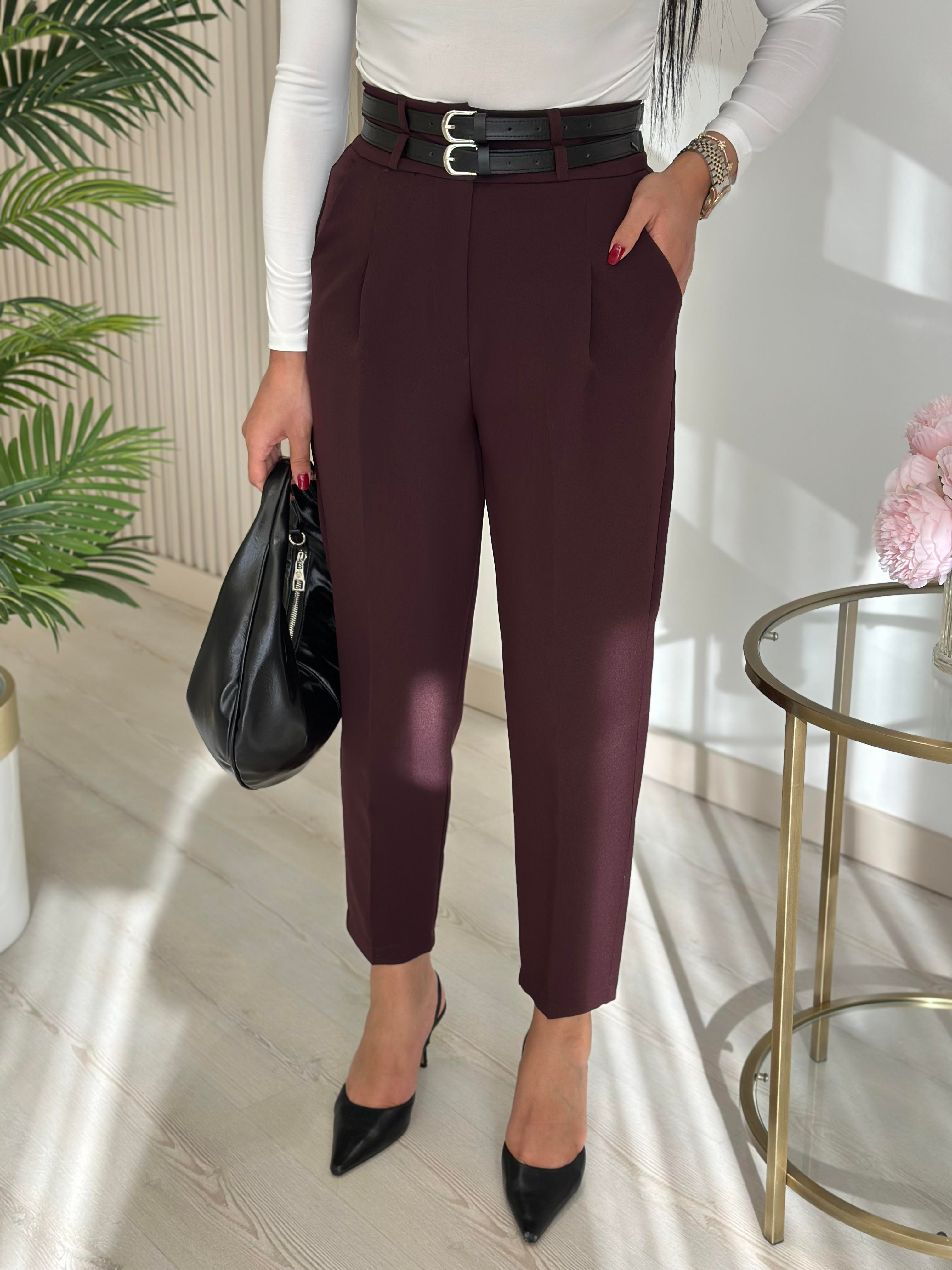Çift Kemerli Yüksek Bel Atlas Kumaş Pantolon Mürdüm