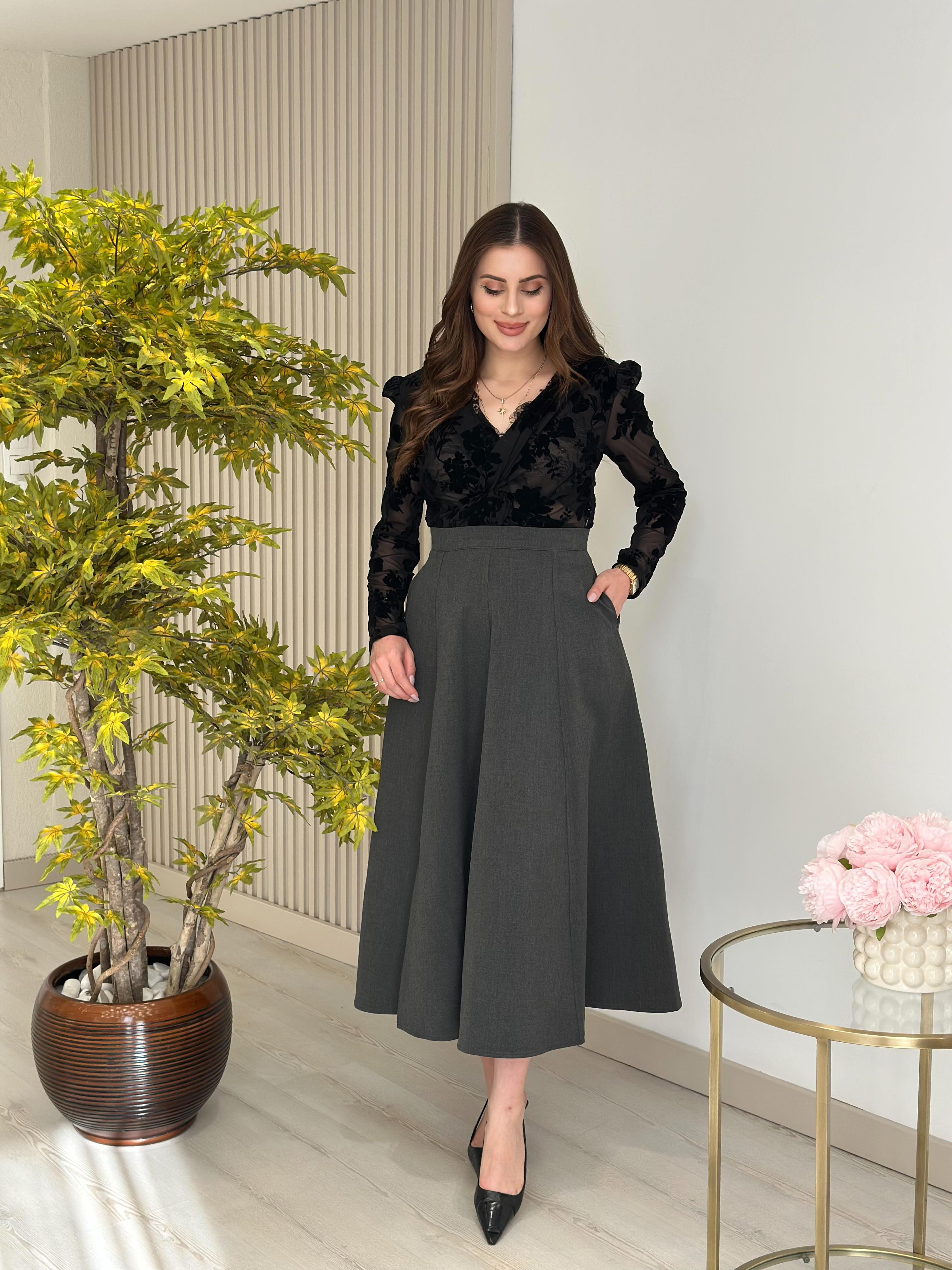 Kloş Yırtmaçlı Midi Boy Etek Antrasit