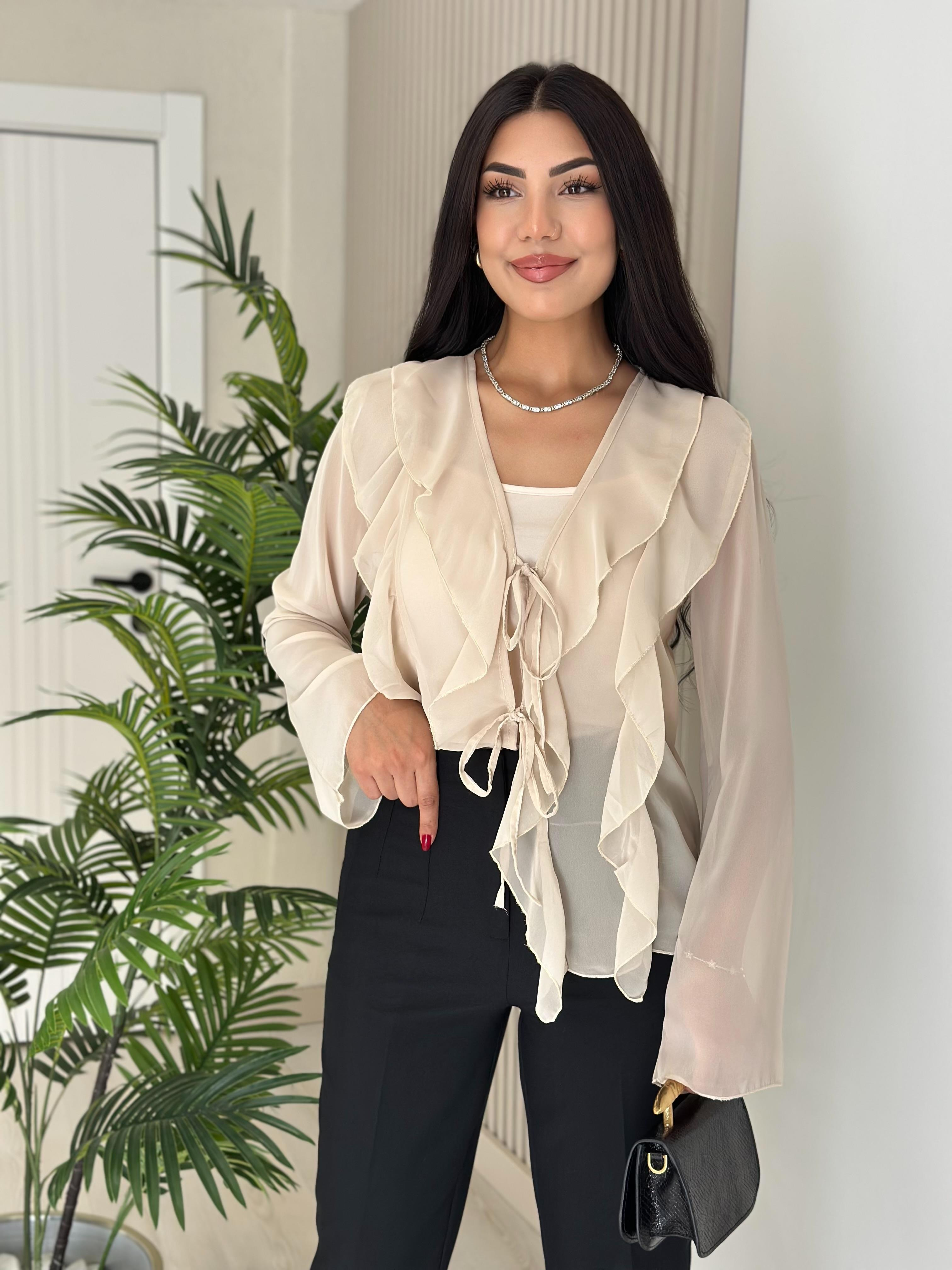 Önü Fırfır Detaylı Bağlamalı Bluz Bej
