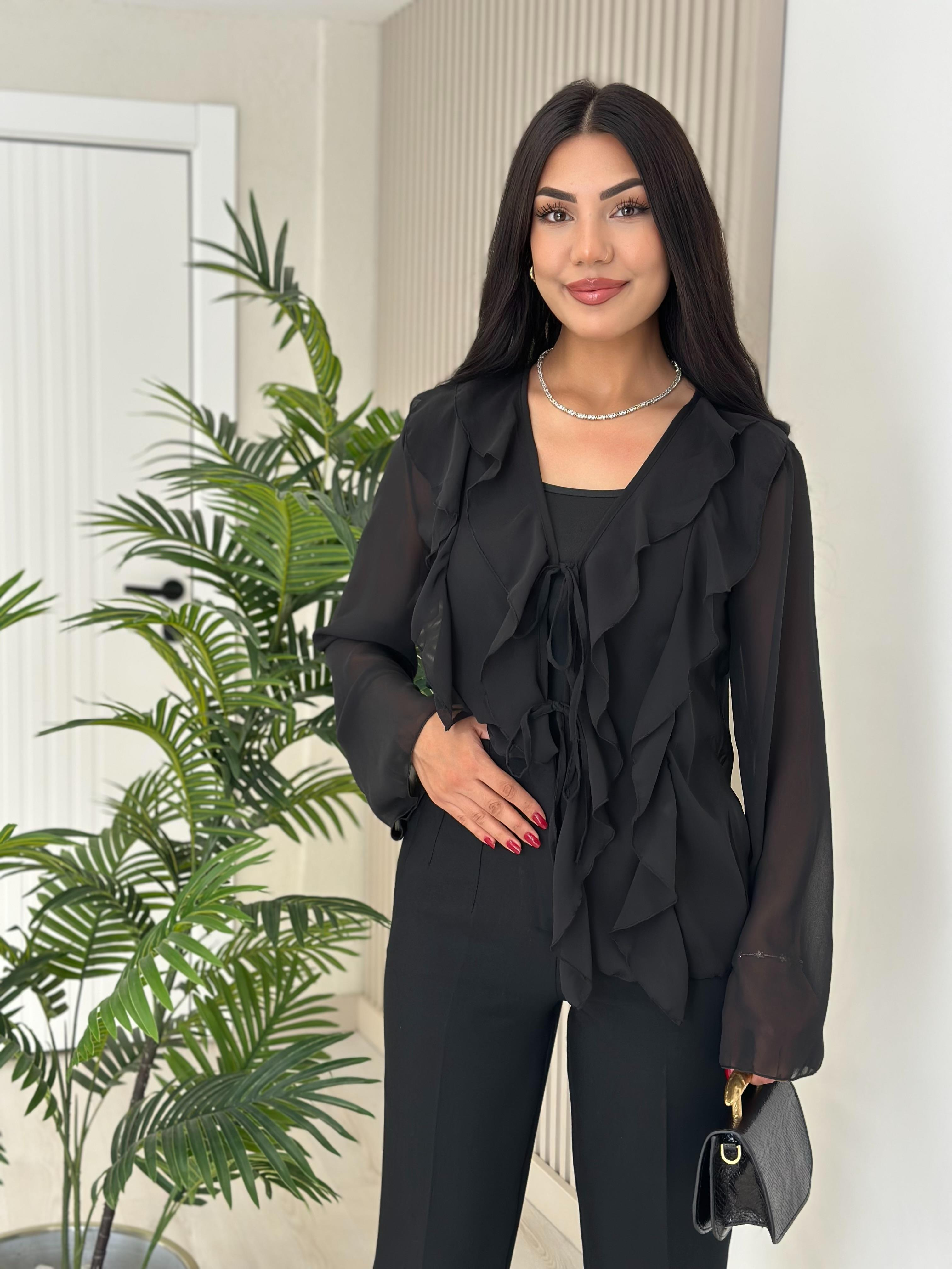 Önü Fırfır Detaylı Bağlamalı Bluz Siyah