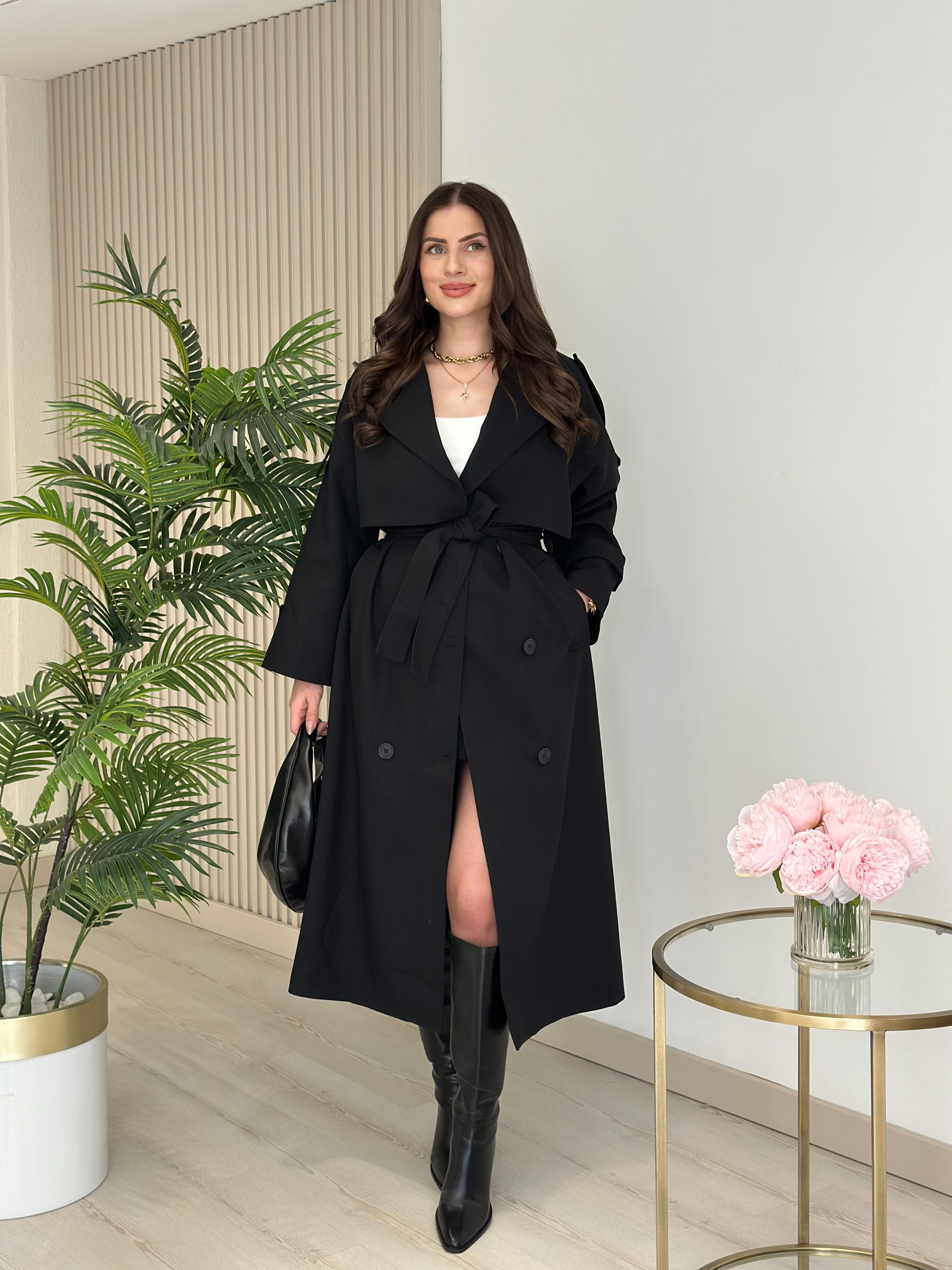 Premium Seri Poliviskon Kuşaklı Trençkot Siyah