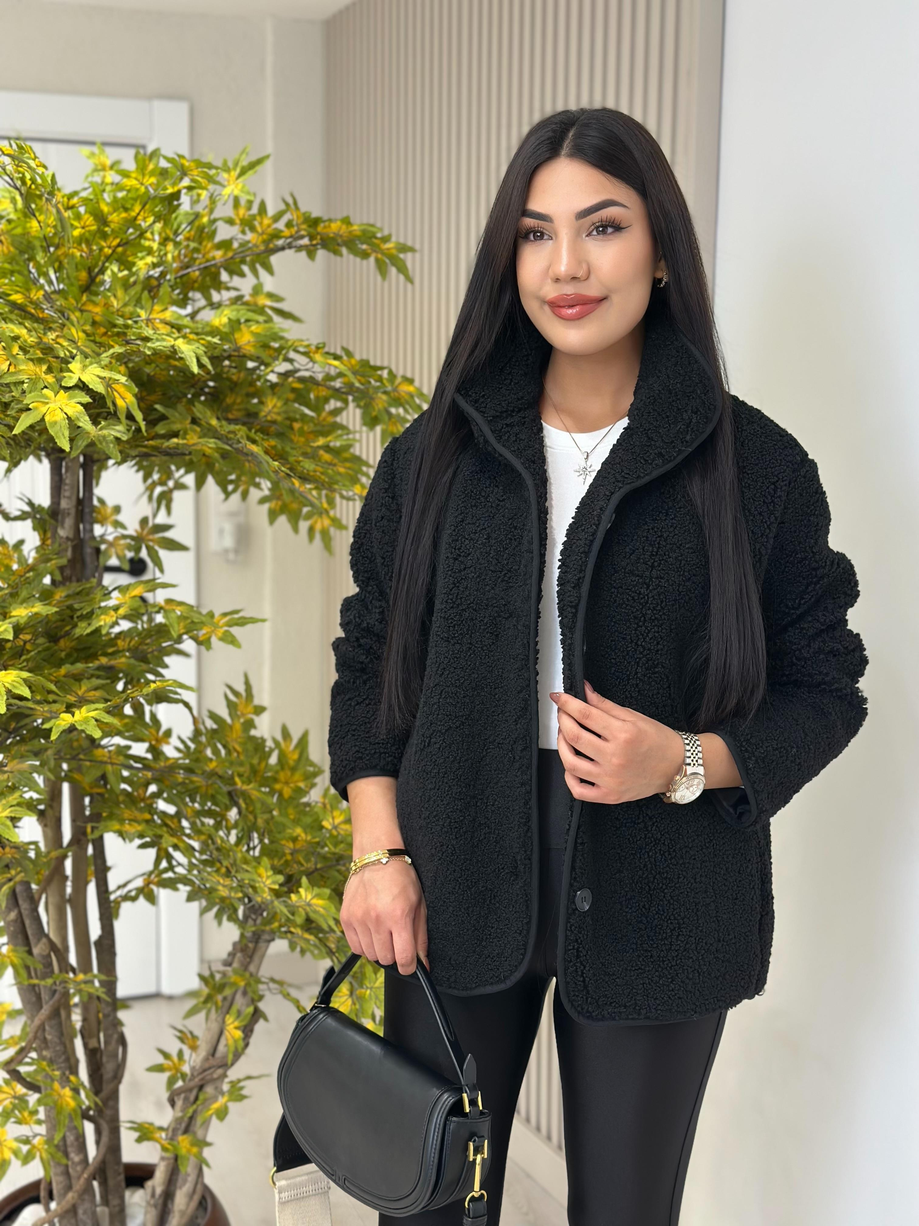 Teddy Önü Düğmeli Dik Yaka Biker Mont Siyah