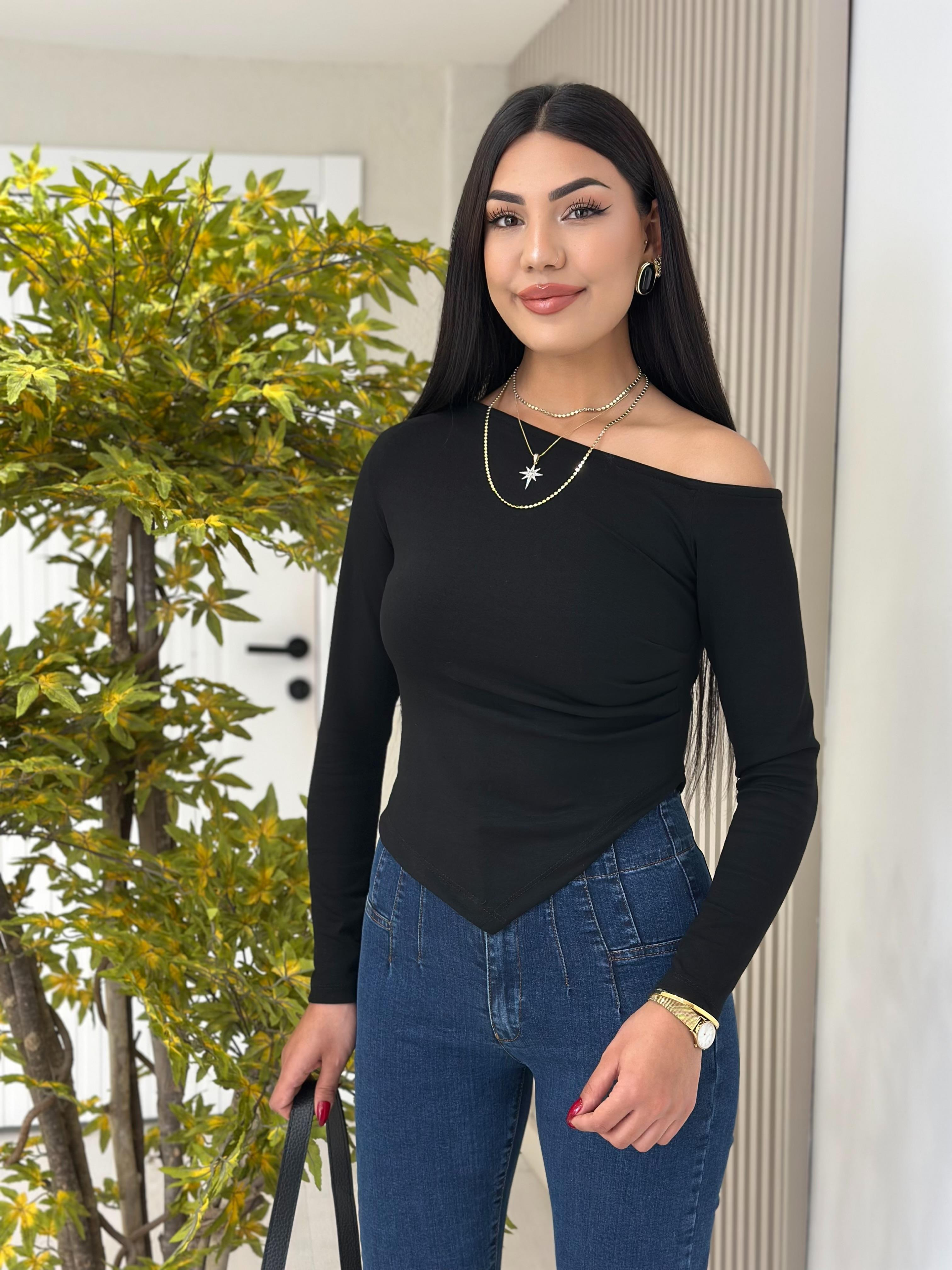 Tek Omzu Dekolteli Beli Drapeli Modal Bluz Siyah