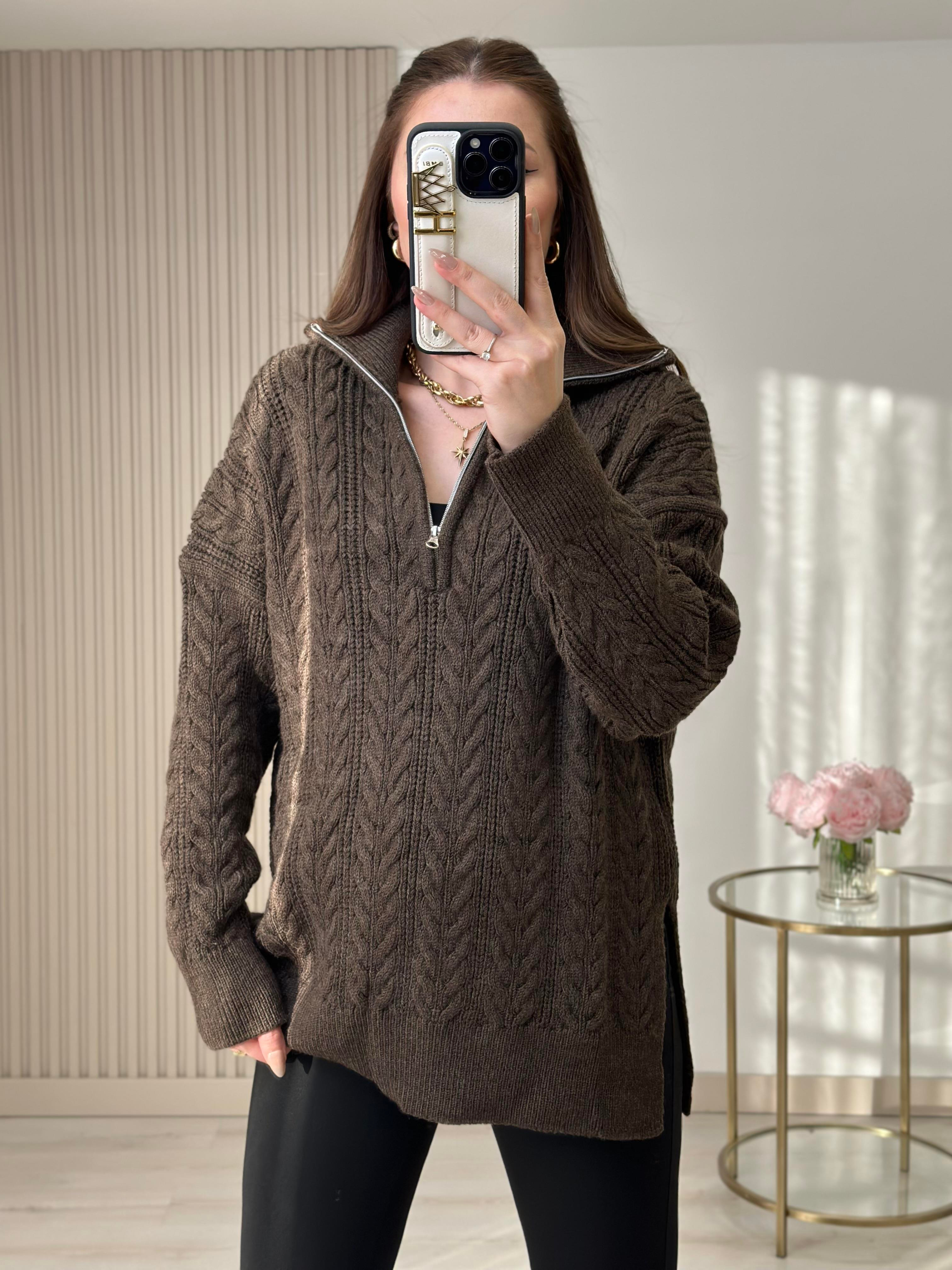 Yakası Fermuarlı Yanlardan Yırtmaçlı Oversıze Kazak Acı Kahve