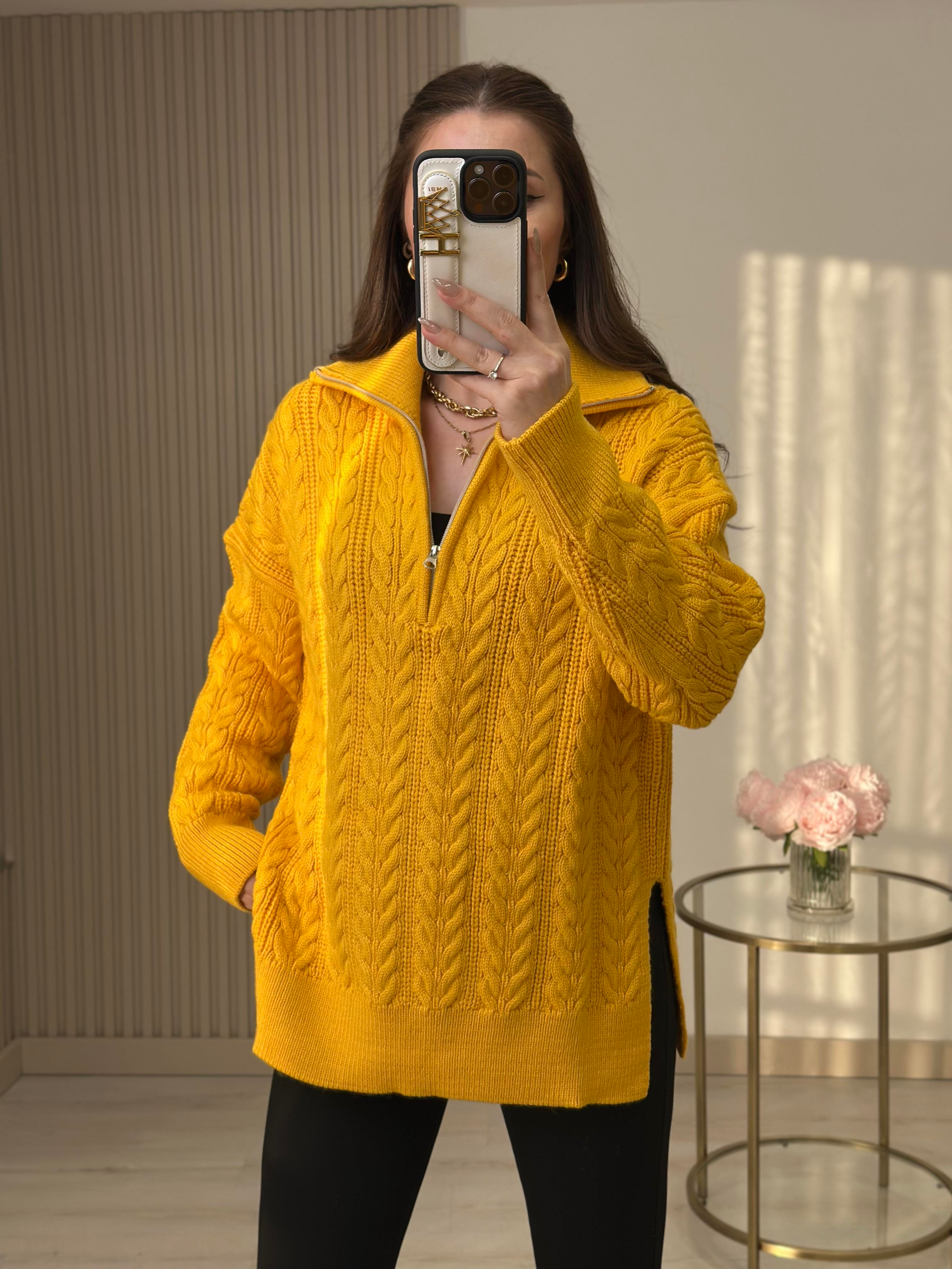 Yakası Fermuarlı Yanlardan Yırtmaçlı Oversıze Kazak Hardal Sarısı