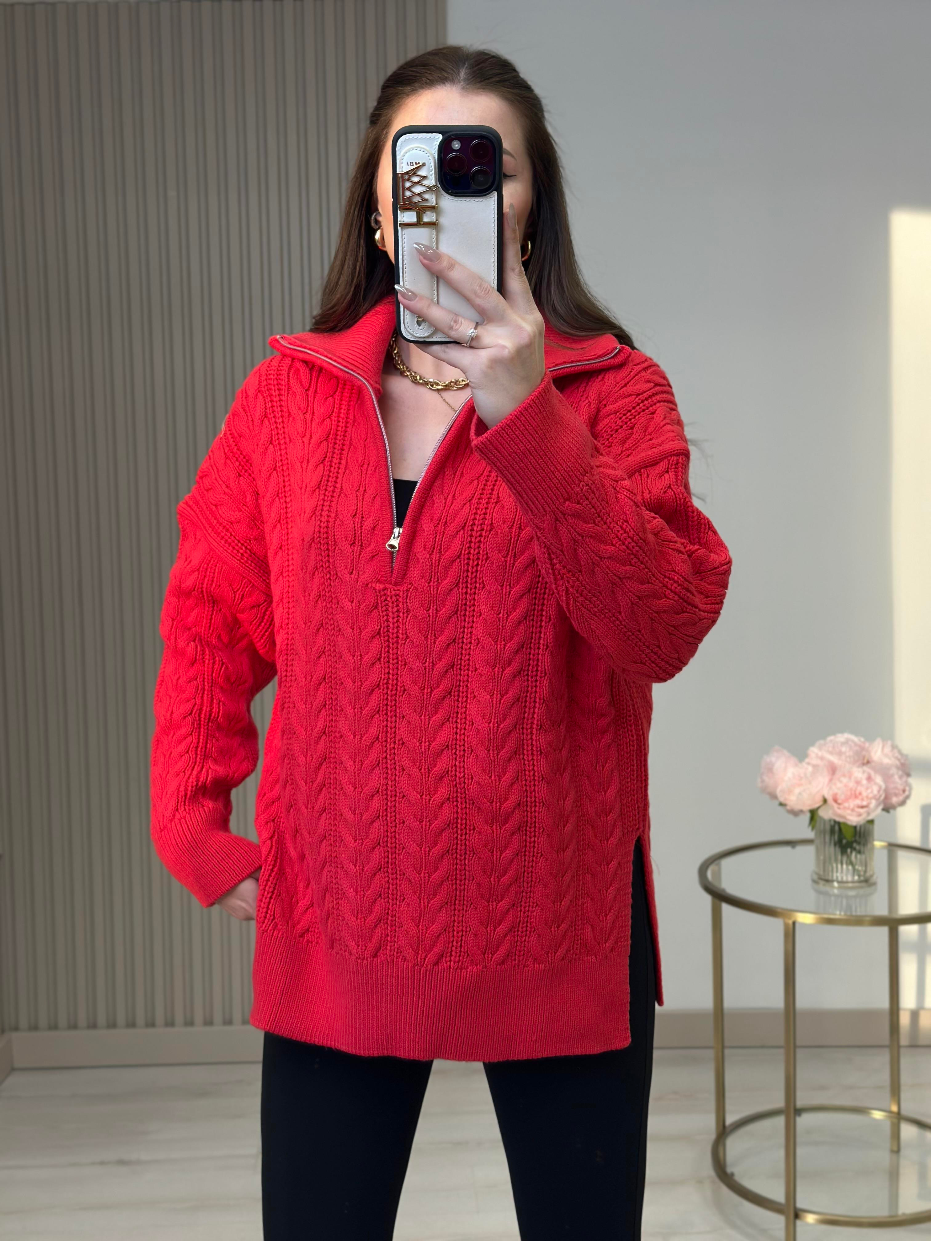 Yakası Fermuarlı Yanlardan Yırtmaçlı Oversıze Kazak Nar Çiçeği