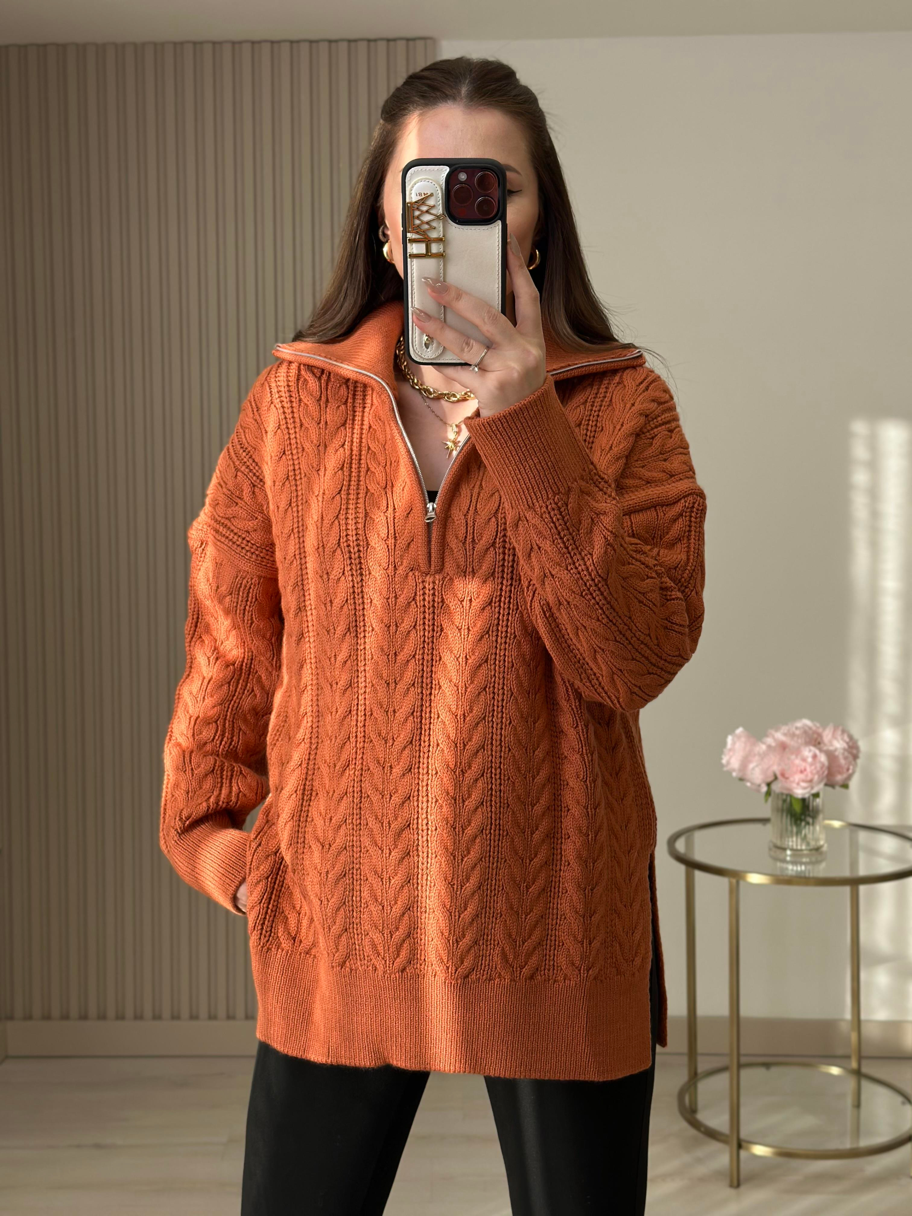 Yakası Fermuarlı Yanlardan Yırtmaçlı Oversıze Kazak Kiremit