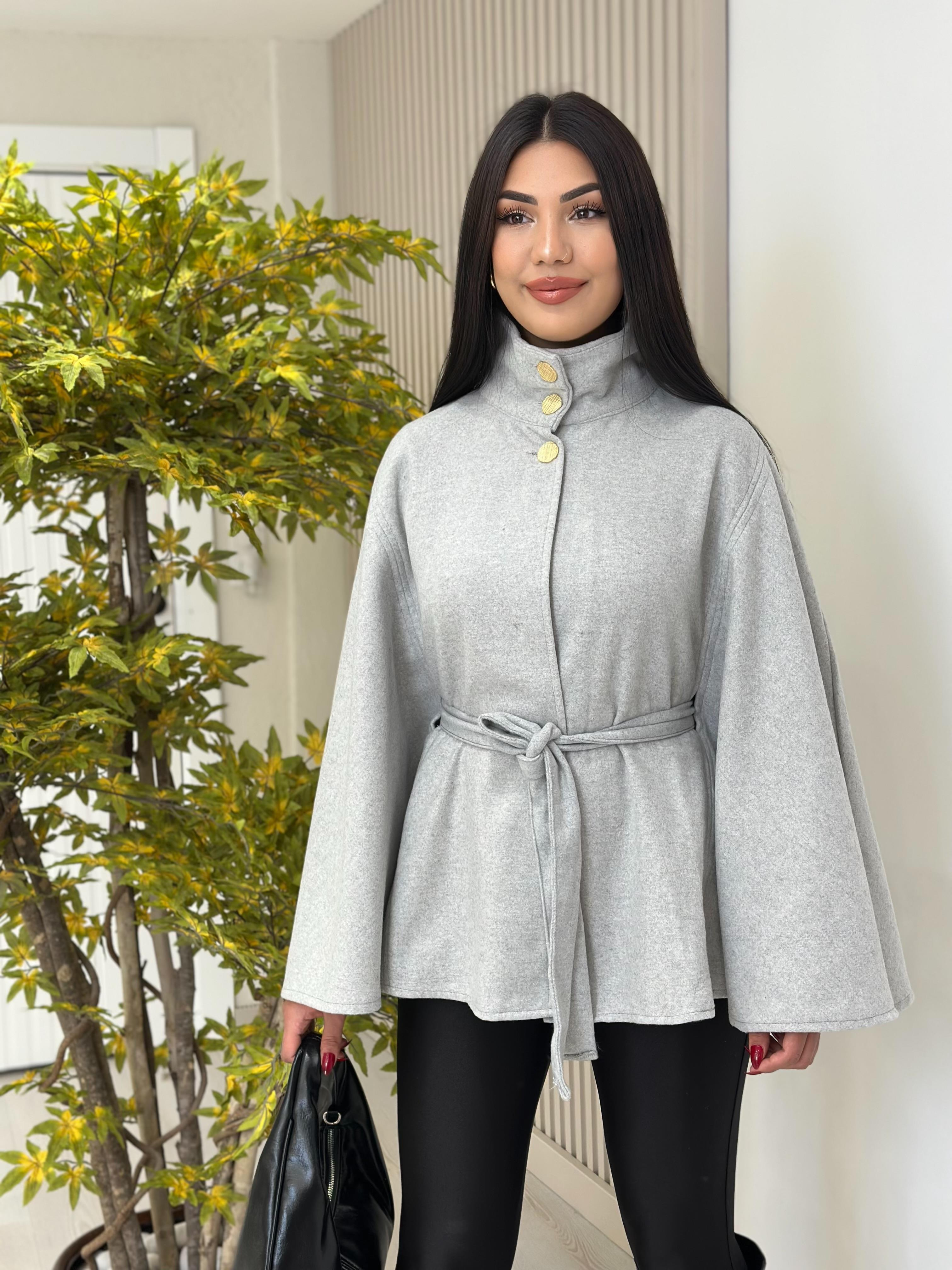 Yakası Gold Düğmeli Kaşe Panço Gri