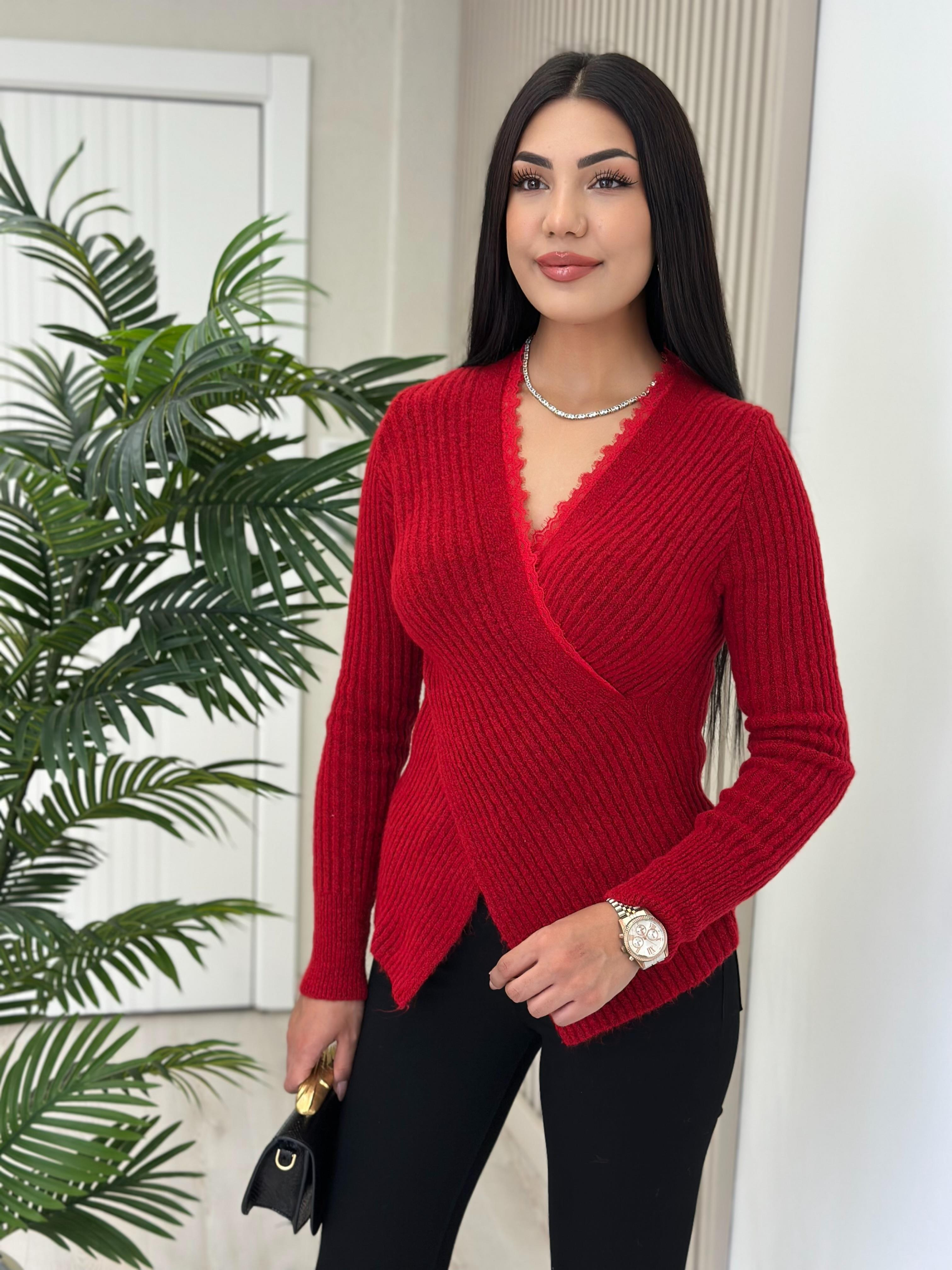 Yakası Güpürlü Yumoş Çapraz Kazak Kırmızı