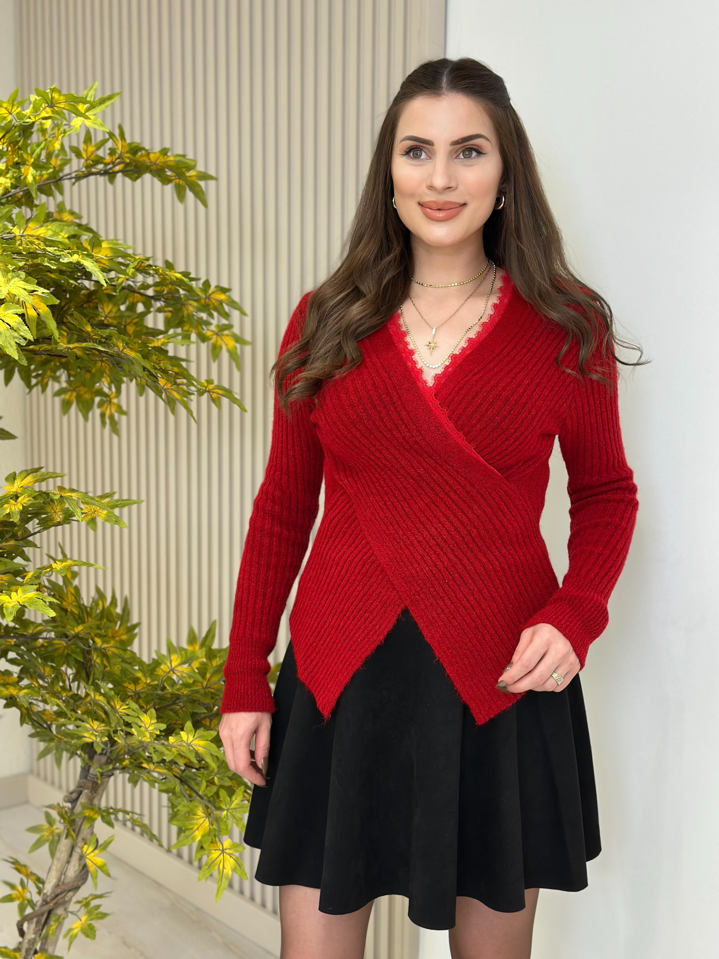 Yakası Güpürlü Yumoş Çapraz Kazak Kırmızı