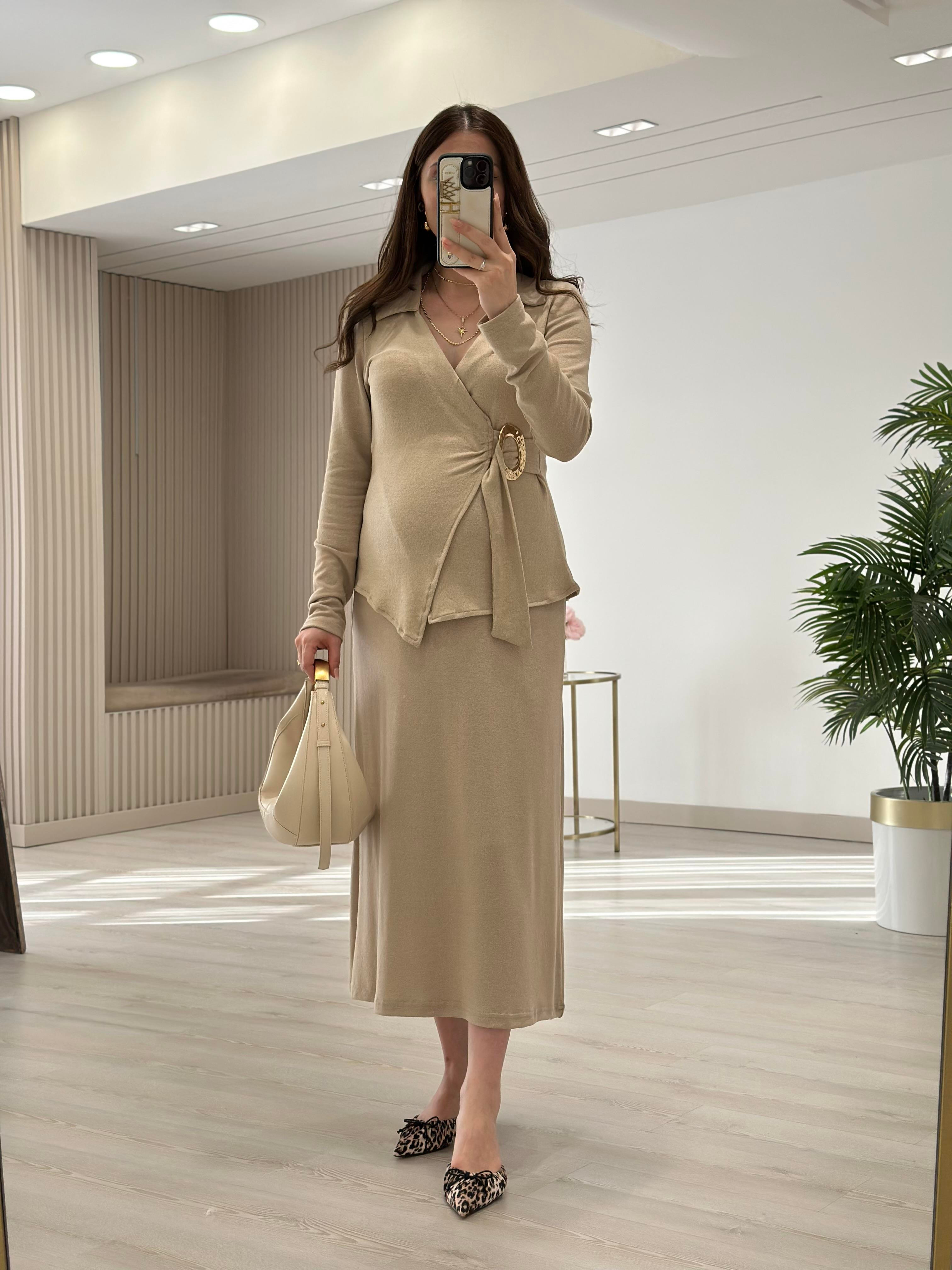 Yumoş Kumaş Gold Tokalı Etekli Takım Bej