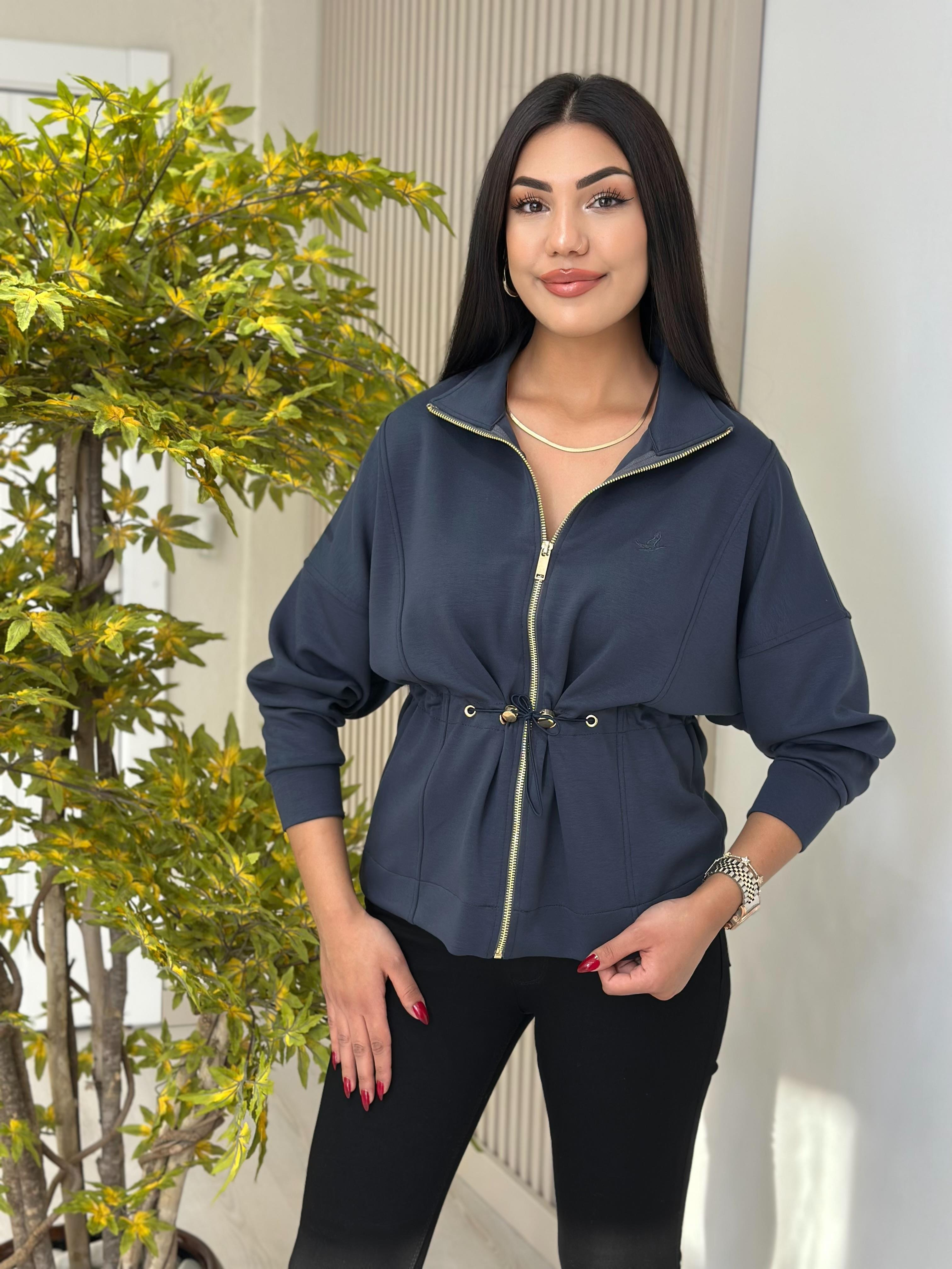 Bel Büzgü Detaylı Gold Fermuarlı Modal Ceket Lacivert