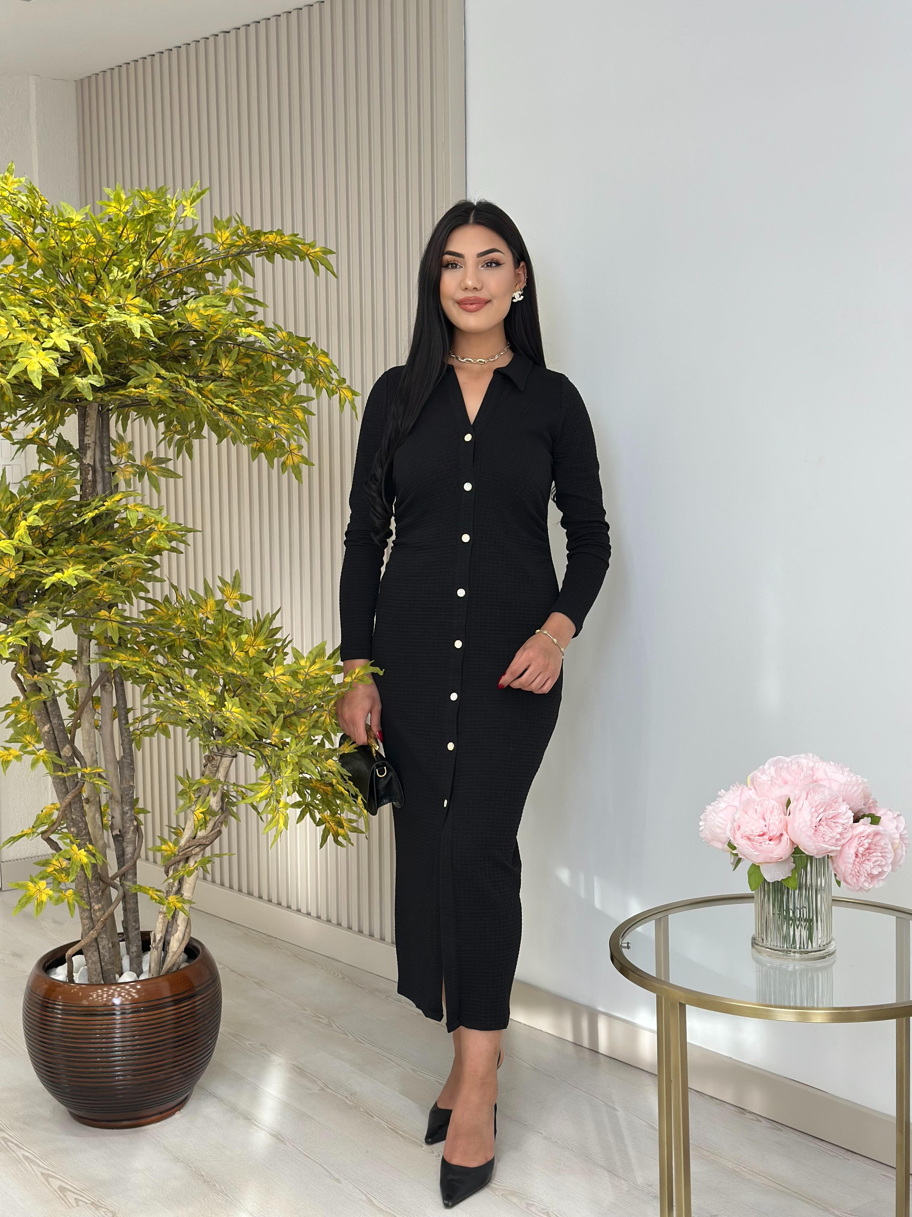 Gold Düğmeli Beli Drapeli Gömlek Yaka Elbise Siyah
